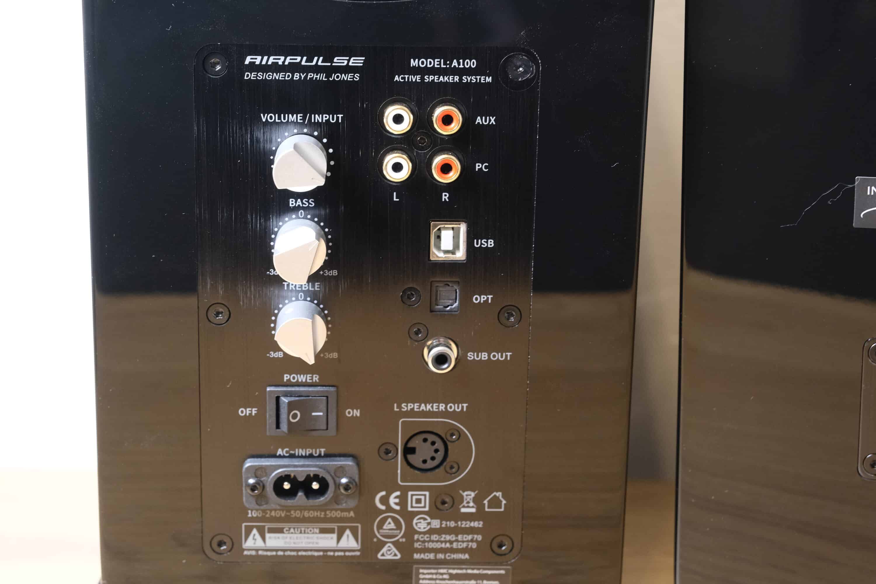 Die Anschlüsse auf der rechten Seite sind natürlich selbsterklärend. Hier kann auf Wunsch sogar ein dedizierter Subwoofer verbunden werden, um die Regallautsprecher in ein 2.1-System zu verwandeln. Optisch geben die Airpulse A100 jedenfalls eine hervorragende Figur ab und lassen sich dank Schaumstoff-Polstern sogar leicht angewinkelt aufgestellt werden können – was dem Klang natürlich zu Gute kommt.