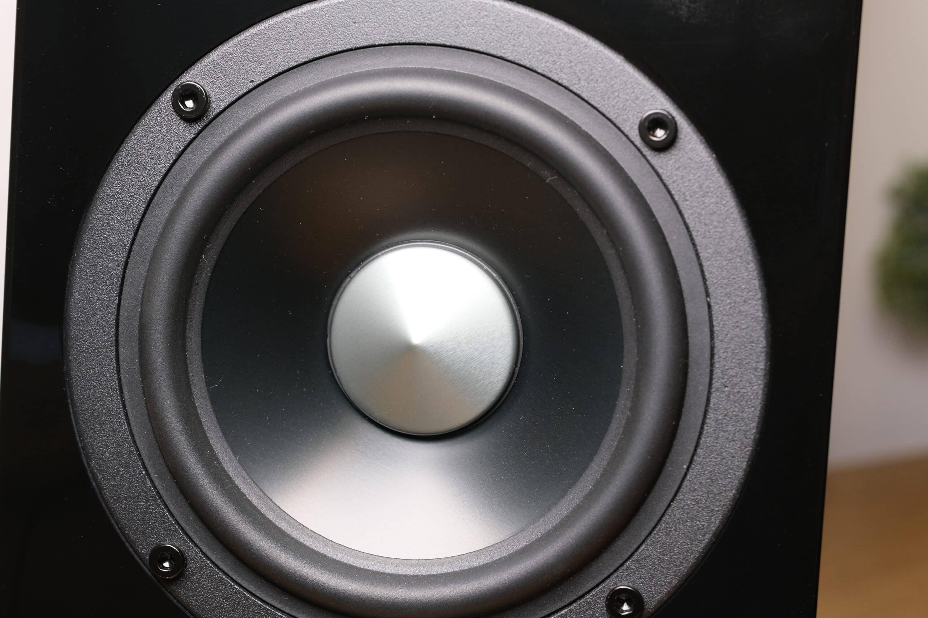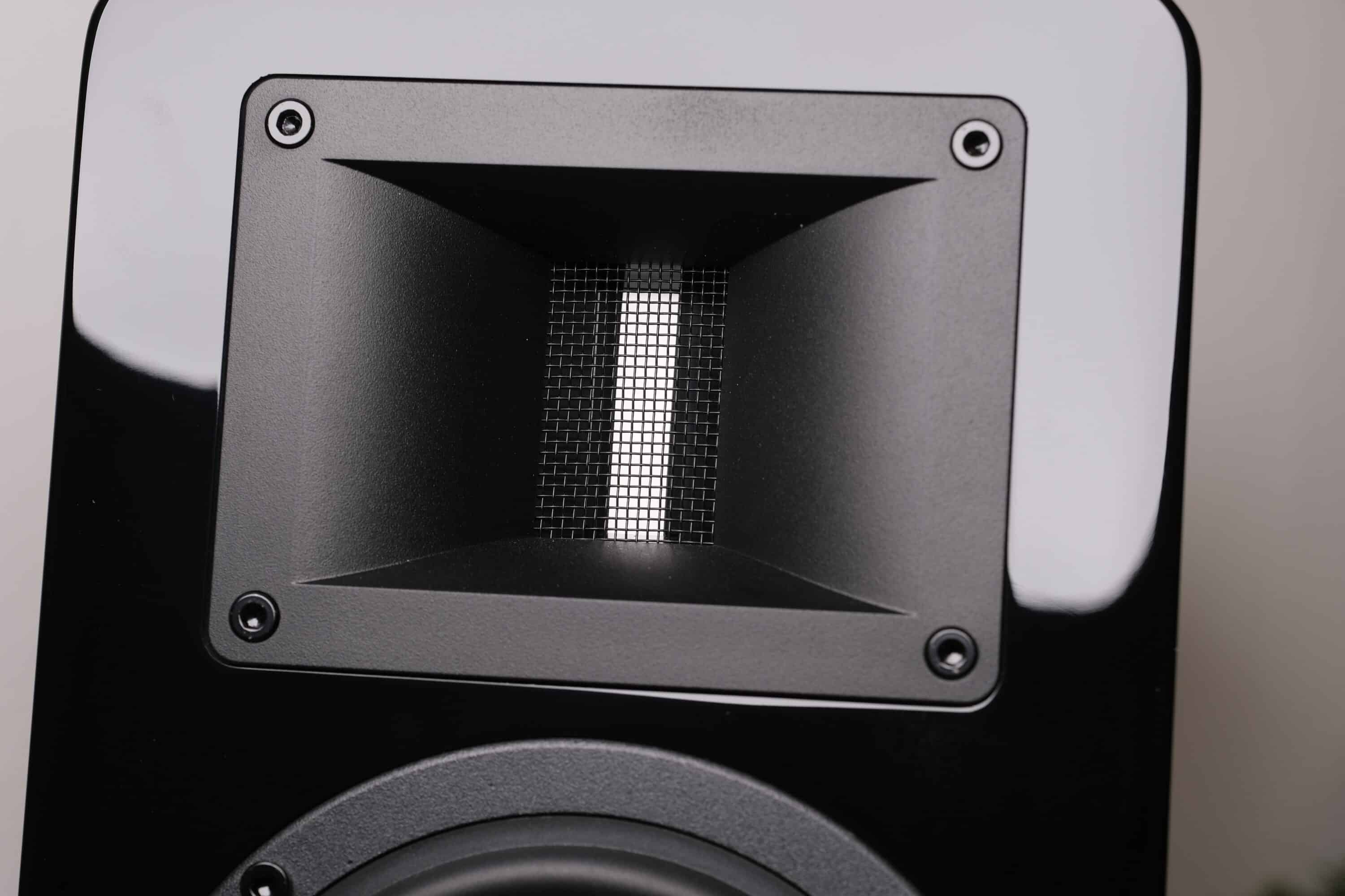 Ansonsten kommen die Lautsprecher schlicht und edel daher. Viel zu sehen gibt es nicht. An der Vorderseite findest du im oberen Bereich den Hochtöner in einem rechteckigen Kästchen, gesichert durch ein Gitter.
