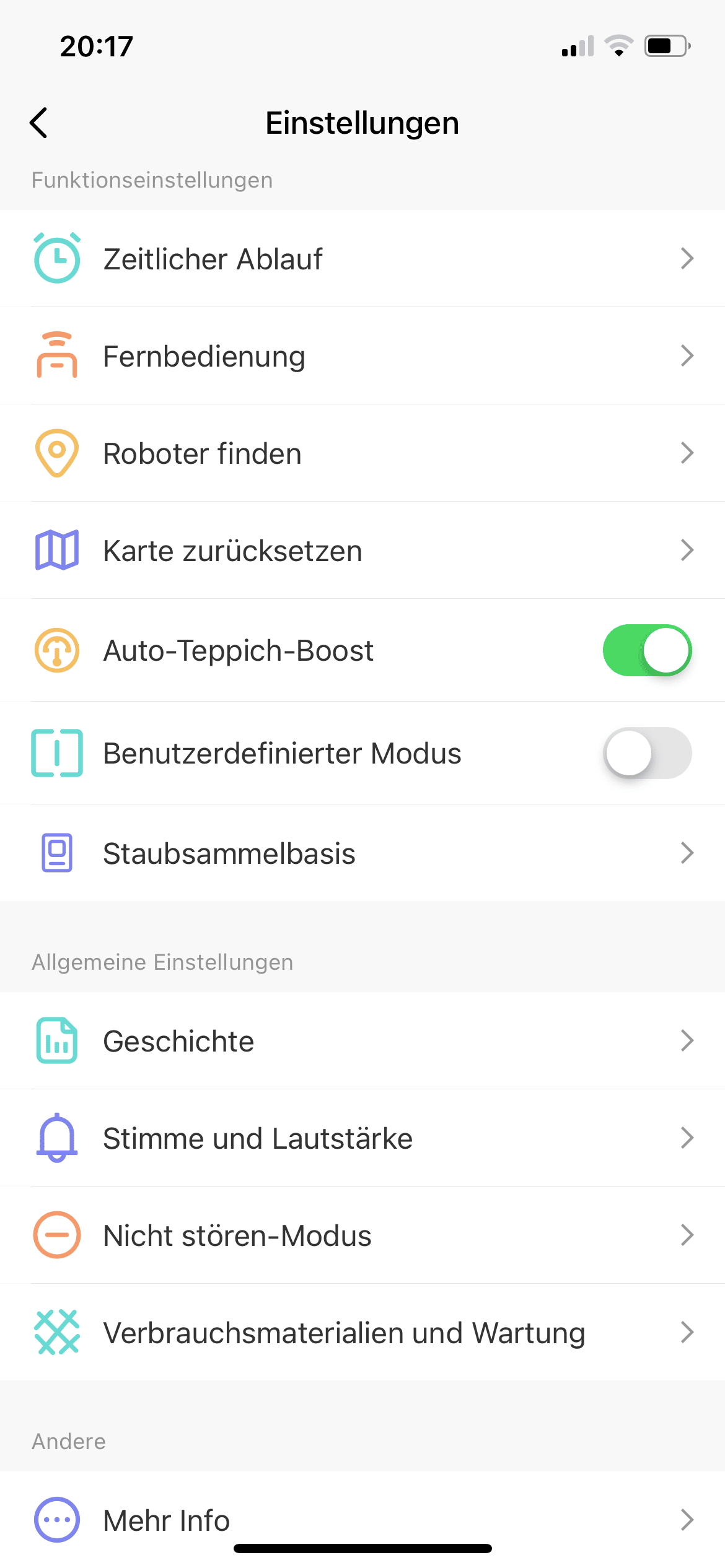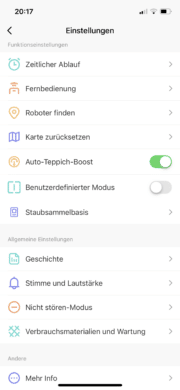Über den rötlich hinterlegten Button „Mehr“ stehen weitere sinnvolle Konfigurationen zur Verfügung. Unter anderem findet der Anwender hier einen Timer, mit dem sich feste Reinigungszeiten einstellen lassen. Auch lässt sich hier die Karte zurücksetzen und man findet weitere Einstellungen, die die Absaugstation betreffen.