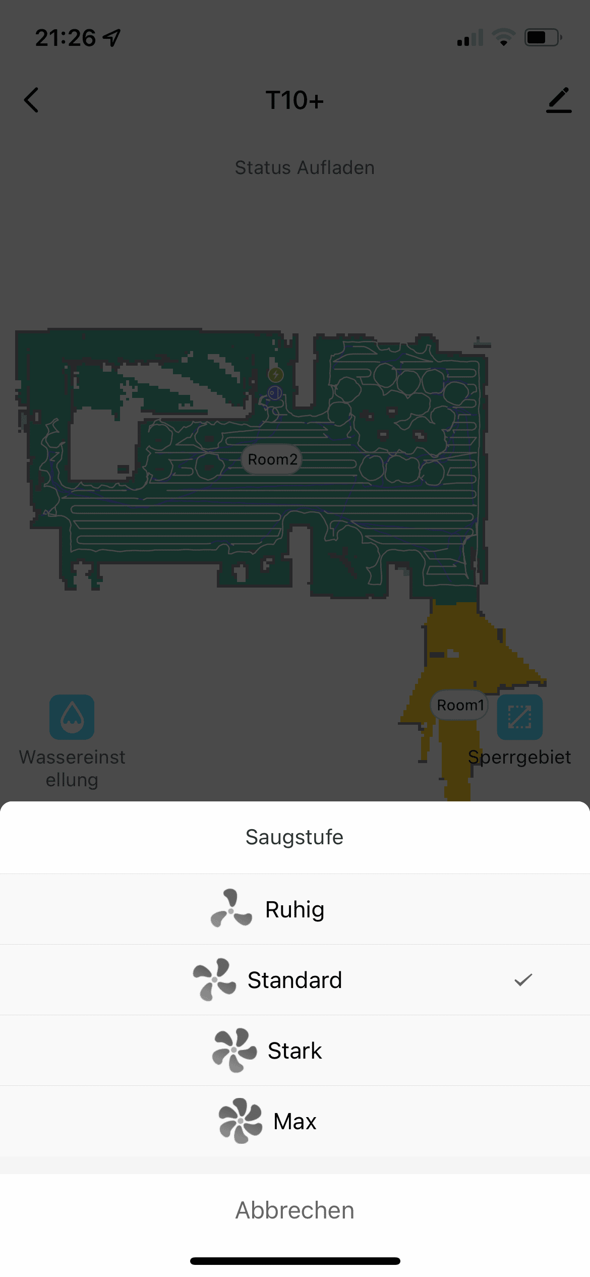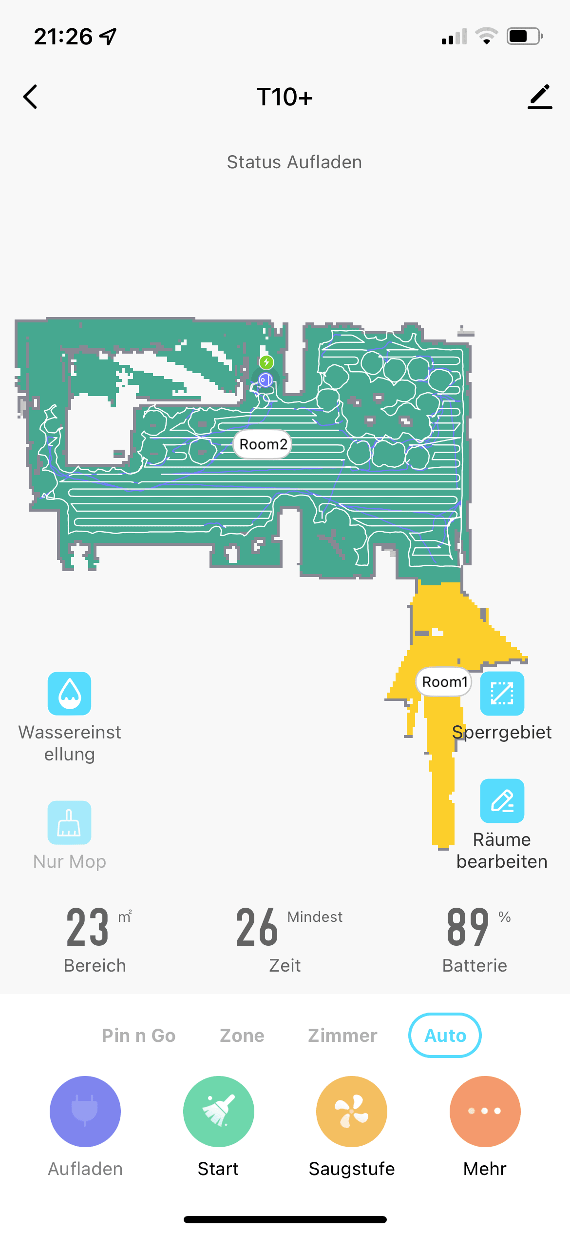Die App bietet einige Funktionen, mit denen man den T10+ nicht nur umbenennen kann, sondern bietet auch zahlreiche Modifikationen und Anpassungen, die den Saugroboter frei nach den eigenen Ansprüchen agieren lassen. Das beginnt bereits auf der Startseite, welche eine Art Dashboard mit verschiedenen Funktionen darstellt. Über die farblich hinterlegten Buttons, lässt sich das Aufladen des Akkus anstoßen, der Reinigungsvorgang kann gestartet werden und die unterschiedlichen Saugstufen können hier mit einem Klick angepasst werden. Zusätzlich kann man auf einen Blick sehen, wie groß die zu reinigende Fläche ist und welche Zeit dafür aufgewendet werden muss. Hier findet man auch ganz bequem den Akkustand, der in der App ganz liebevoll „Batterie“ genannt wurde. Über die blau hinterlegten Felder an der linken Seiten lässt sich einstellen, ob nur gewischt werden soll und mit welcher Intensität bzw. Wassermenge. An der rechten Seite befinden sich weitere Einstellungsmöglichkeiten, die die Räume an sich betreffen. Über die Funktion „Sperrgebiet“ lassen sich bequem Bereiche definieren, die der T10+ gekonnt ignorieren soll. Über „Räume bearbeiten“ lässt sich die Raumaufteilung anpassen, sollte dies nicht bei der ersten Fahrt nicht vollends geklappt haben. Zu guter Letzt befinden sich oberhalb der bunten Felder weitere Funktionen, mit denen man den Saugroboter gezielt in einzelne Zimmer oder Bereiche schicken kann.