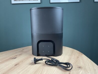 Die Absaugstation bietet nicht nur die Funktion der automatischen Schmutzentleerung des Staubbehälters, sondern fungiert auch als Ladestation, an der der Roboter geladen wird. Sie ist zum großen Teil in mattschwarz gehalten und in der Front finden sich kleinere schwarz glänzende Applikationen wieder. Darunter ein kreisrunder Einsatz, hinter dem sich ein kleiner Farbmonitor befindet, der die unterschiedlichen Zustände des Roboters anzeigt. Zum Beispiel, wird dieser gerade geladen und auf welchem Stand befindet sich der Akku gerade.