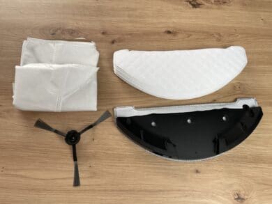 Neben dem Saugroboter und der Absaugstation legt der Hersteller einiges an Zubehör bei. Darunter auch Verbrauchsmaterialien wie austauschbare Wischtücher, die nach der Verwendung ihren Weg in den Müll finden. Sowie zwei allergikerfreundliche Einweg-Staubbeutel und eine Bürste als Ersatz.