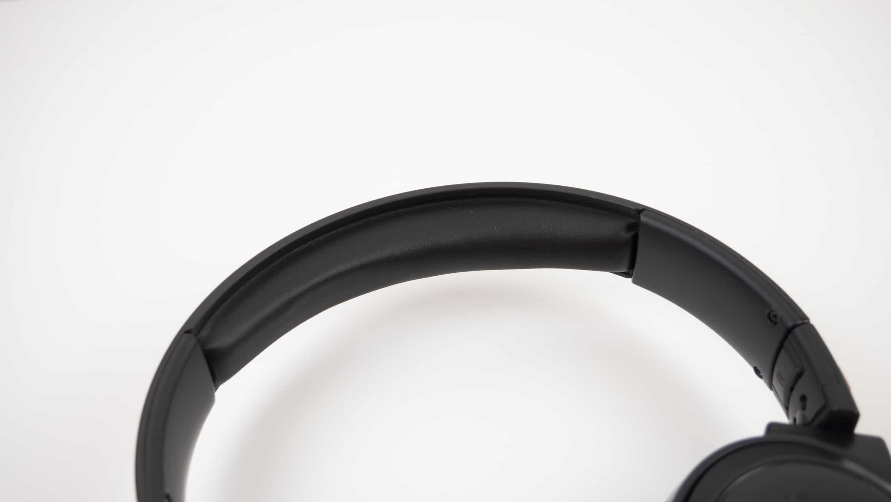 Ansonsten ist der Aufbau – inklusive Bügel und Over-Ears-Schalen – aus robustem Kunststoff gefertigt. Für ein nachhaltig bequemes Tragegefühl hat der Bügel noch ein üppiges in Kunstleder verpacktes Kopfpolster erhalten. Inwiefern der Kopfhörer aufgesetzt werden muss, zeigt ein weiß-roter Stoff mit den Buchstaben L und R in den Innenseiten der Hörer.
