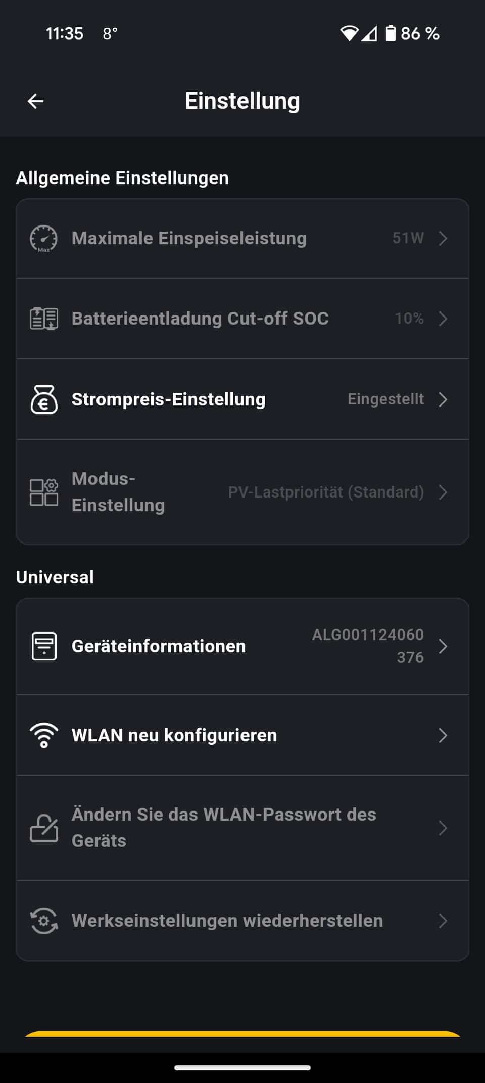 Darüber hinaus lassen sich über die App natürlich auch wichtige Einstellungen vornehmen. Eine der wichtigsten Beispiele dafür ist die Höhe der maximalen Eingangsleistung. Hier habt ihr die Wahl zwischen mindestens 50 und maximal 2000 Watt. Wer mehr als 800 Watt nutzen möchte, der muss das Balkonkraftwerk inklusive Speicher mit eingebautem Wechselrichter von einem Elektriker abnehmen lassen.
