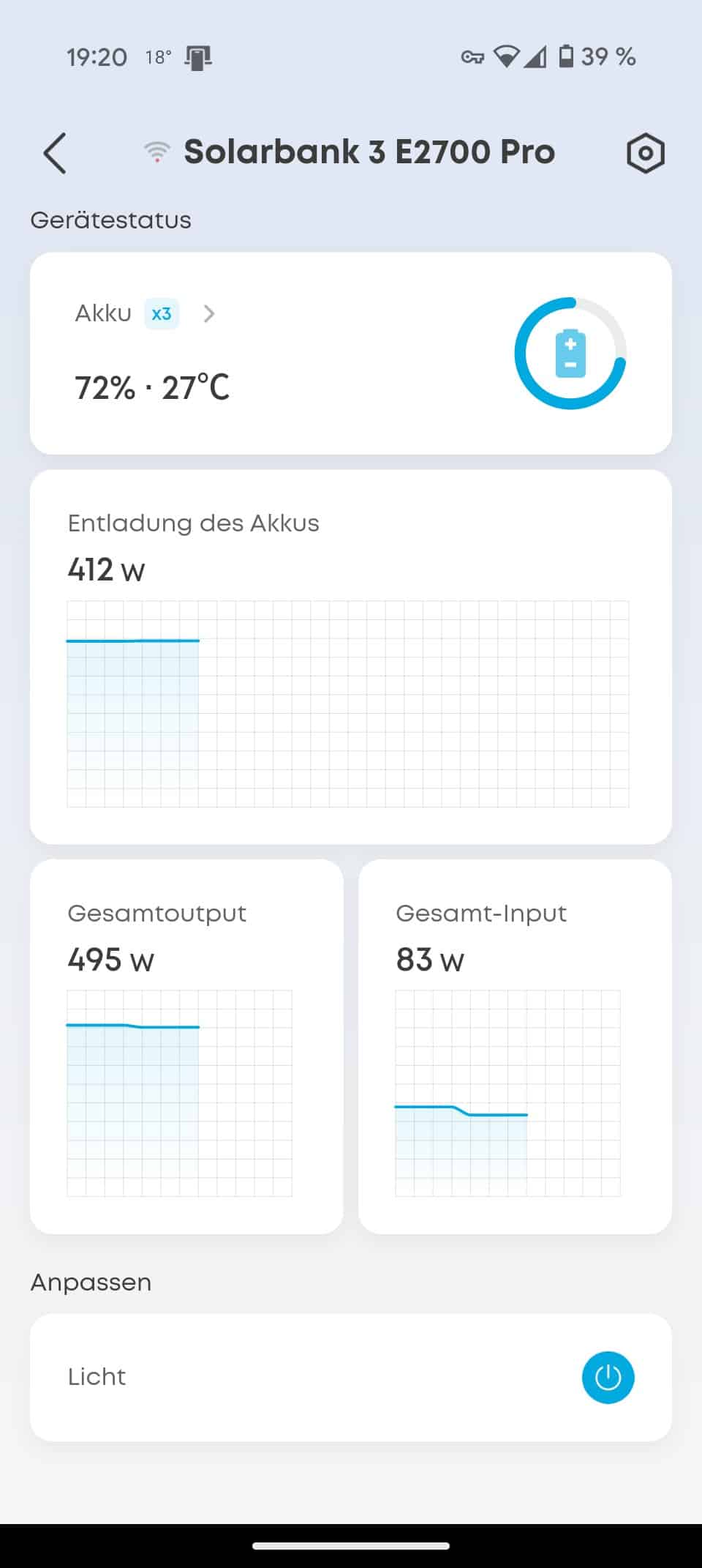 So lässt sich aus dem Balkonkraftwerk schnell eine waschechte PV-Anlage zaubern. Doch es steigt dann nicht nur die Gesamtkapazität des Systems, sondern auch die Leistung. Die Gesamtleistung der Solarbank 3 Pro beträgt in der Basisausstattung 1,2 kW. Schließt man vier Systeme zusammen werden daraus 4,8 kW. Auch das entspricht den Parametern einer vollwertigen PV-Lösung fürs Dach.