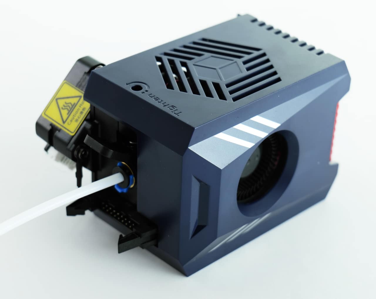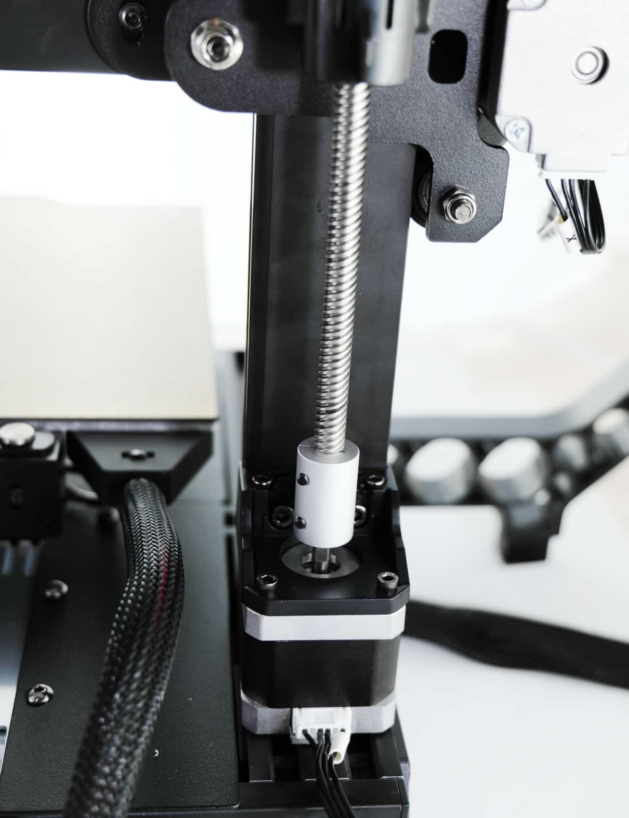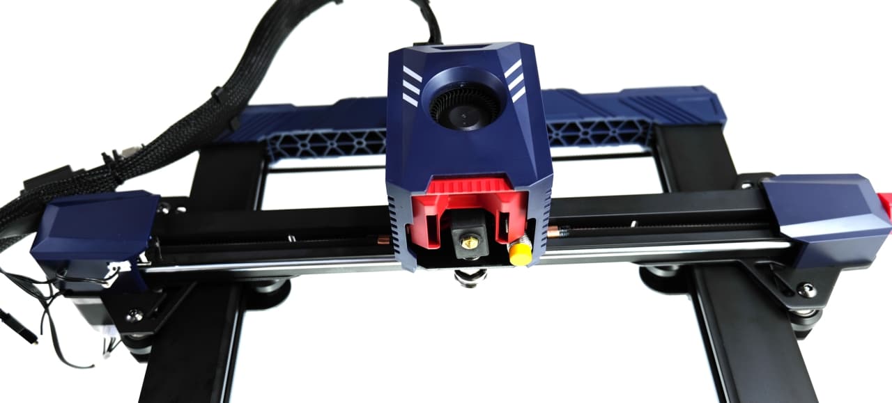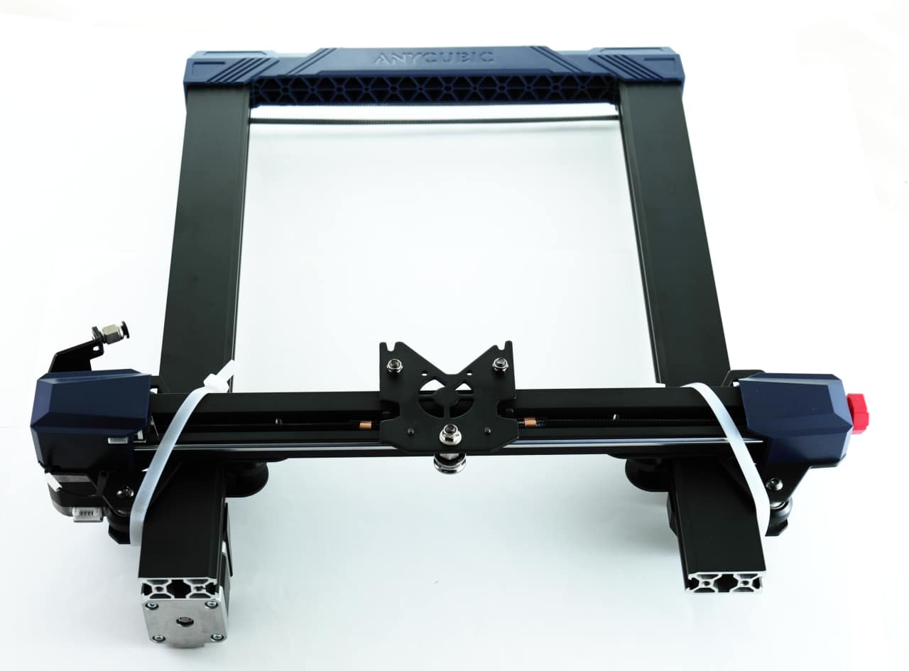 Interessanterweise setzt Anycubic dabei zwar auf eine PTFE-Röhre für das Filament, der Extruder sitzt aber trotzdem direkt hinter dem Druckkopf. Trotz der angepeilten, hohen Geschwindigkeiten, ist die Druckeinheit damit recht schwer. Die Achsen machen aber alle einen sehr stabilen Eindruck, sodass das kaum kritisch sein dürfte.
