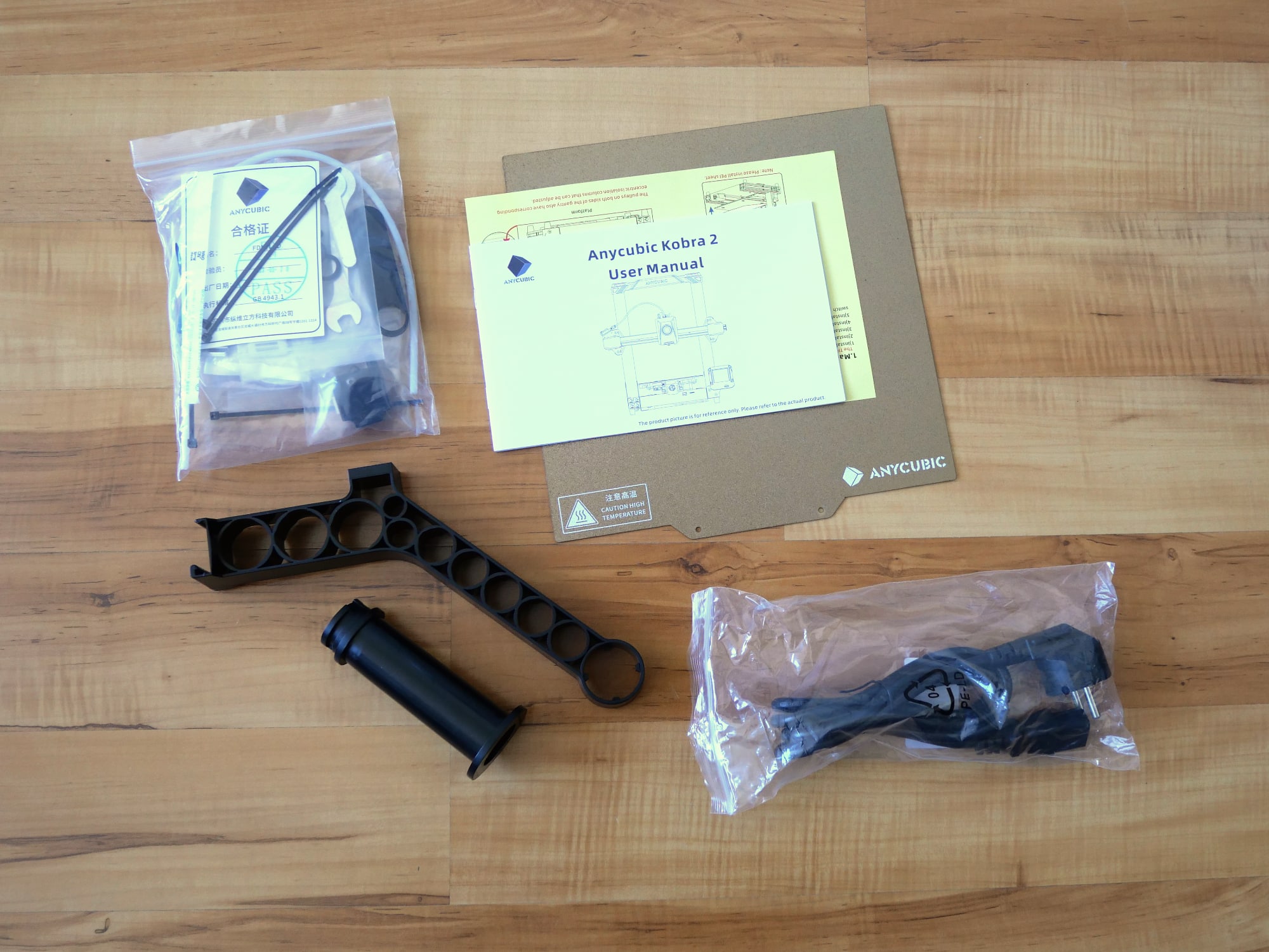 Der Anycubic Kobra 2 kommt in einem ~51 x 49 x 27 cm großen und damit nahezu quadratischen und eher flachen Karton. Die Bauteile sind im Inneren über mehrere Ebenen sicher verstaut und durch schwarzen, festen Schaumstoff voneinander getrennt. Den Großteil des Inhaltes stellen Basis und Rahmen dar. Weiterhin befinden sich unter anderem Druckkopf, LCD-Touchscreen, Filamentsensor, Filamenthalter, Montagematerial, das benötigte Werkzeug und ein Stromkabel im Karton. Damit man direkt nach dem Aufbau und der Ersteinrichtung drauflos drucken kann sind zudem eine microSD-Karte, ein Kartenlesegerät und etwas PLA enthalten. Der vollständige Lieferumfang kann der folgenden Abbildung entnommen werden.