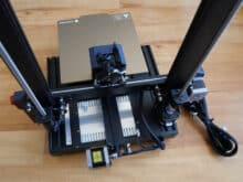 Das grundlgende Design des Anycubic Kobra 2 erinnert an den Vyper, welchen wir bereits testeten. Das Druckbett misst 23 x 23 cm und wird über einen Riemen von einem Motor bewegt. Über rote Kunststoffräder können die Riemen bei Bedarf nachgespannt werden. Der 3D-Druck selbst erfolgt auf einer PEI-beschichteten Federstahlplatte, welche vorne etwas übersteht. Nach dem Druckvorgang und etwas Abkühlung kann man die magnetische Platte samt dem 3D-Druck vorübergehend entfernen. Durch leichtes Biegen der Platte lässt sich dieser nun sehr einfach lösen. Die Höhenachse wird ebenfalls durch einen einzigen Motor auf dem Rahmen bewegt und ermöglicht einen 3D-Druck von bis zu 25 cm Höhe. Die maximale Größe des zu druckenden Objektes liegt bei 25 x 22 x 22 cm.