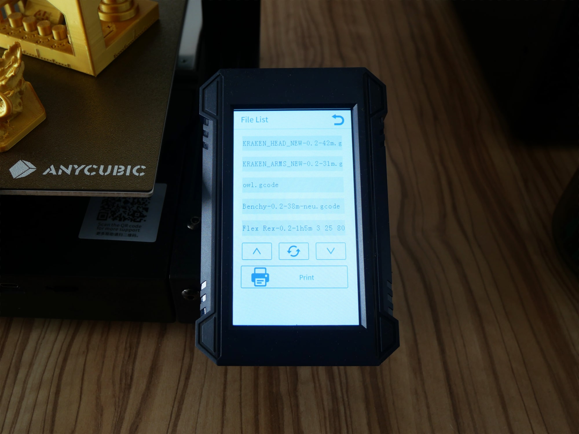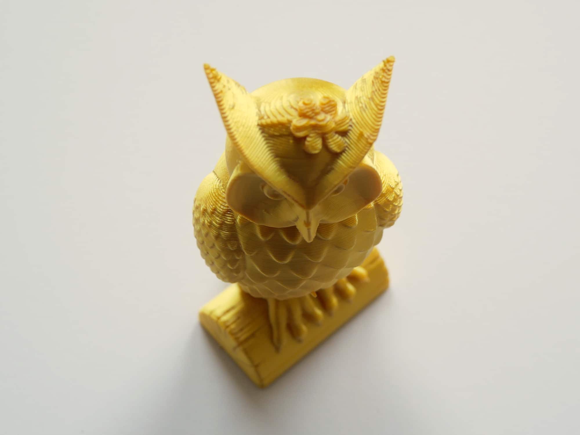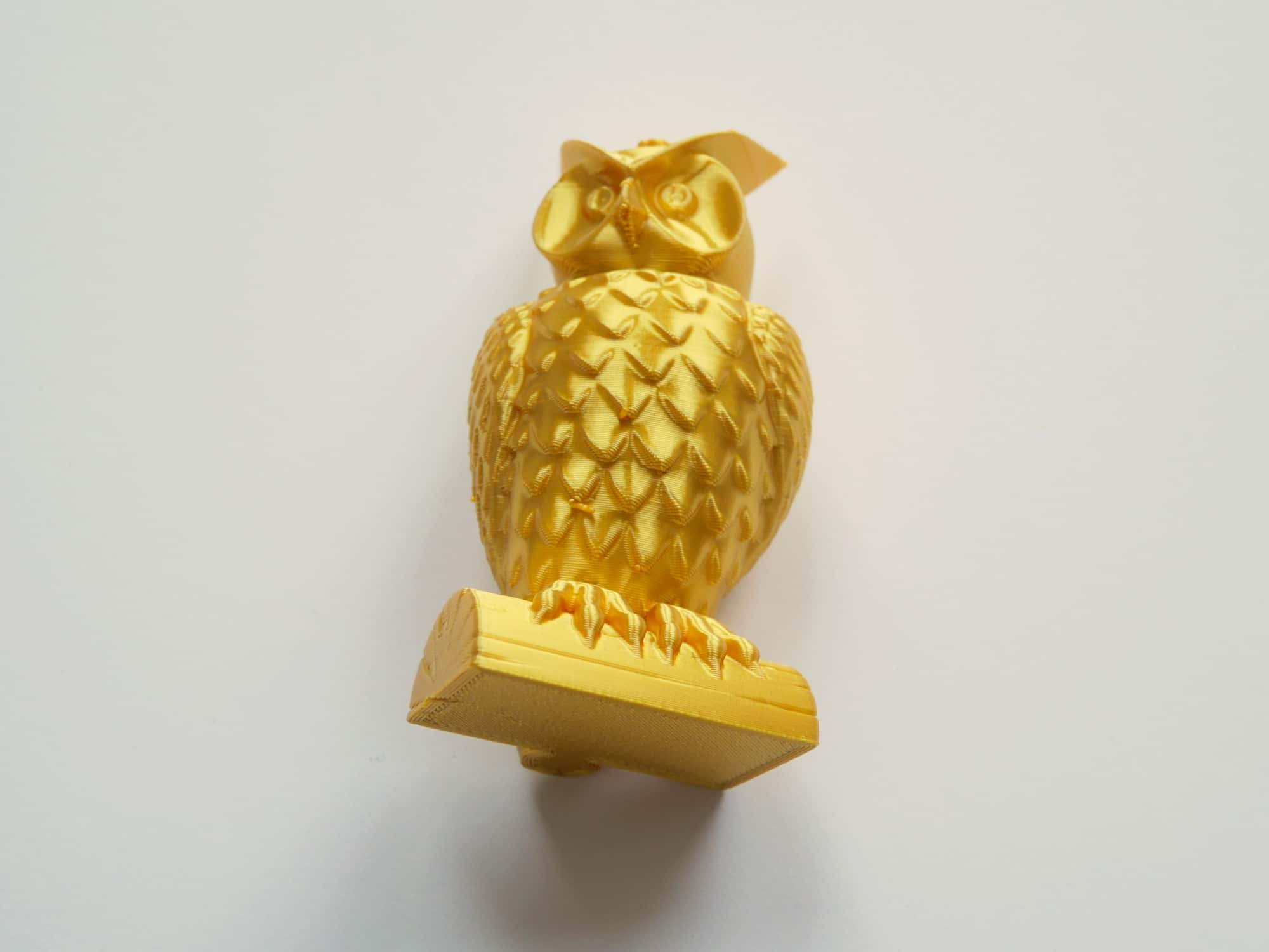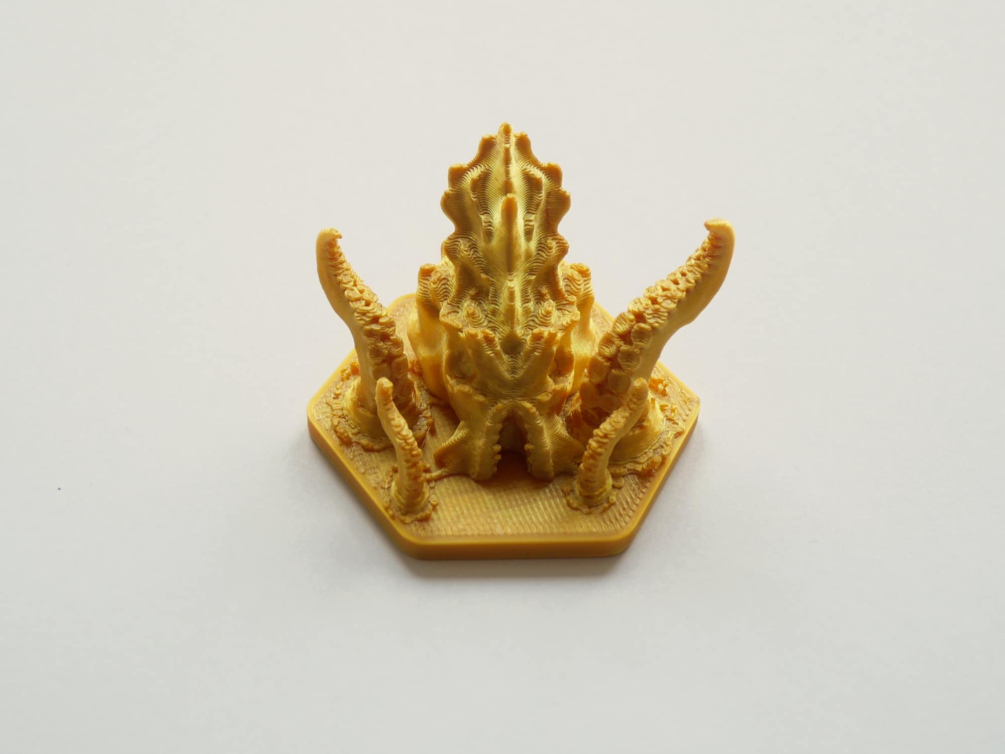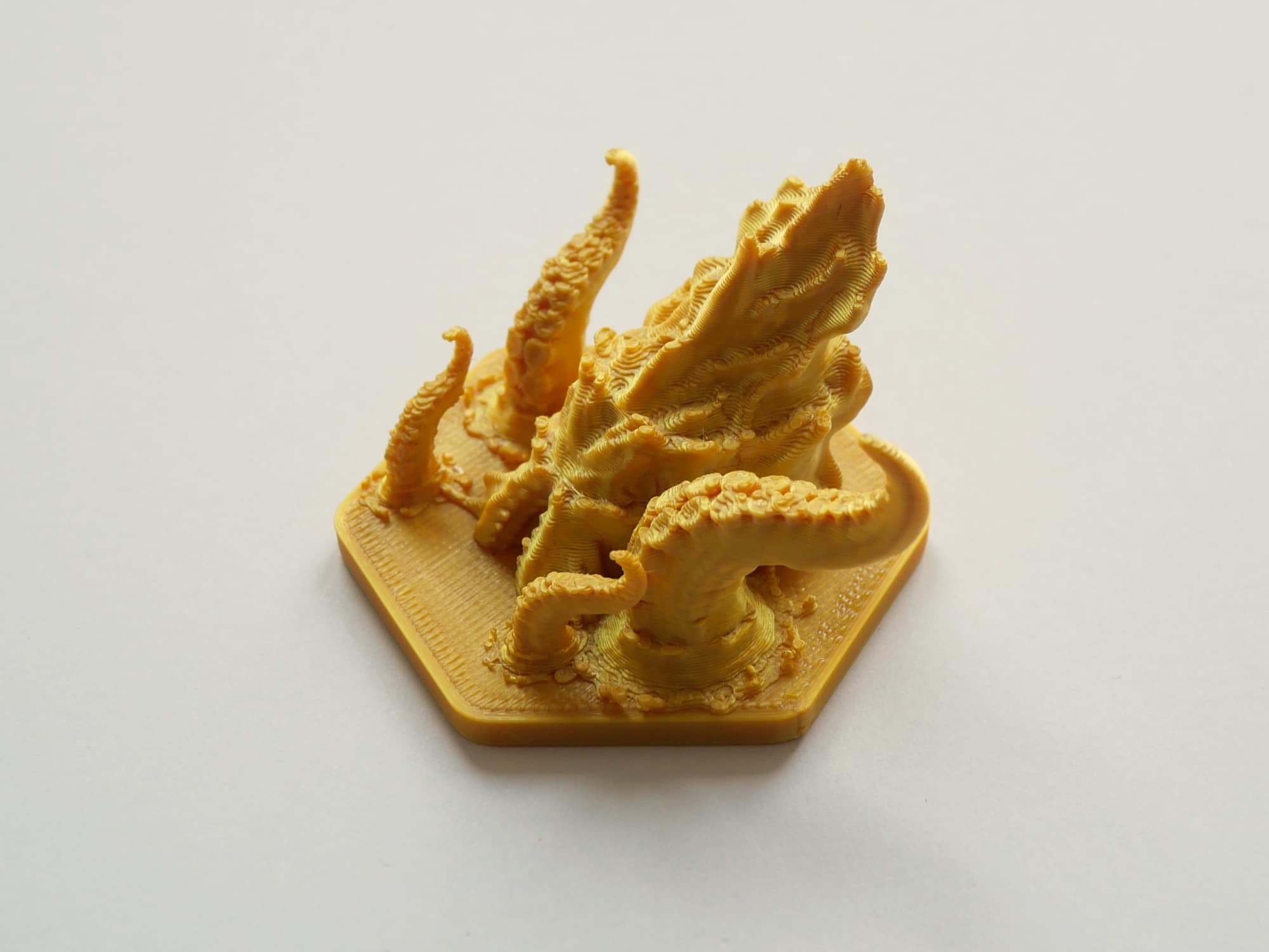 Nach den beiden Dateien, die bereits auf der microSD-Karte waren, druckten wir noch zwei weitere Objekte. Zuerst entschieden wir uns für eine Eule, die bei den Dateien des ersten Anycubic Kobra enthalten ist. Die Druckqualität war hier sehr gut, nur an den Ohren entdeckten wir wieder feine kurze Fäden, welche nachträglich aber problemlos entfernt werden können. Zuletzt druckten wir noch den Kraken eines Brettspiels. Auch hier überzeugte die Druckqualität, die Tentakel und auch die feinen Saugnäpfe wurden sauber gedruckt.