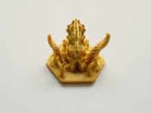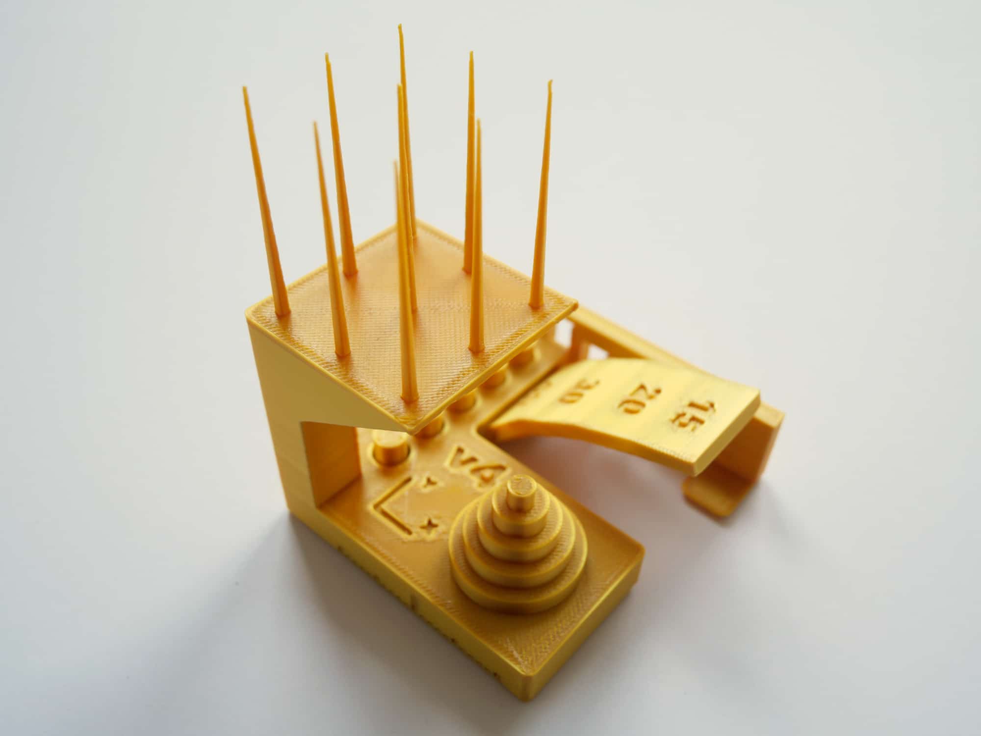 Nach dem Auto-leveling, welches nur wenige Minuten benötigt, haben wir mit hell goldenem Silk PLA die ersten Vorlagen von der microSD-Karte gedruckt.