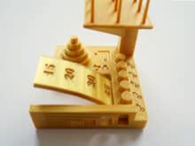 Beim ersten Druck entschieden wir uns direkt für ein größeres Objekt, das viele verschiedene geometrische Formen und auch Zahlen enthält. Der Druck dauerte dauerte insgesamt 2 Stunden und 16 Minuten. Unsauberheiten erkennen wir hier vor allem bei den kleinen Zahlen neben den Zylindern und am Bogen, welcher vor allem rechts noch leicht nachgearbeitet werden muss.