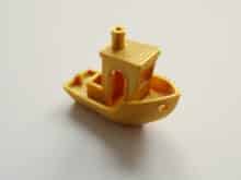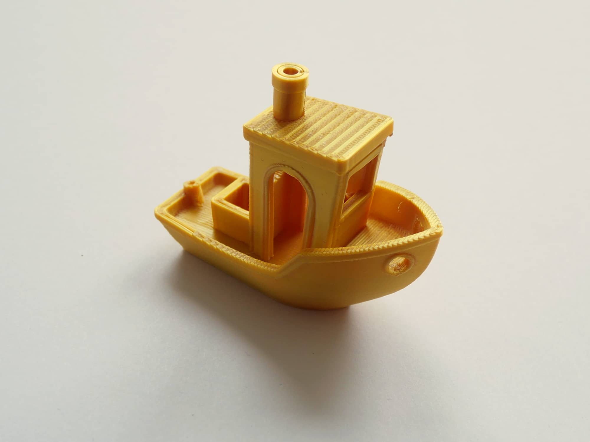 Beim zweiten Druck handelt es sich um das bekannte 3D-Benchy, ein kleines Boot. Der Druckvorgang dauerte insgesamt nur 30 Minuten und kann qualitativ größtenteils überzeugen. Die Türen, das Dach und die Löcher wurden sauber gedruckt, bei letzteren entdeckten wird jedoch feine kurze Fäden, die für eine nicht optimale Temperatur sprechen. Der Schriftzug auf der Unterseite ist sauber gedruckt, der deutlich kleinere Schriftzug auf dem Heck weist dagegen Schwächen auf. Bei letzterem steht dort, wo die nächste Ebene begonnen wurde, etwas Filament über.