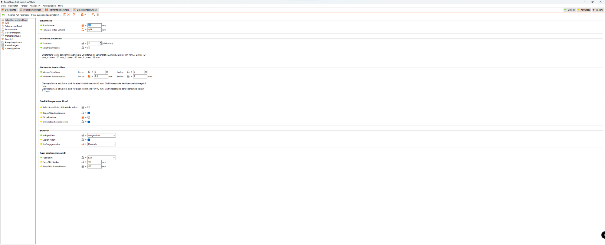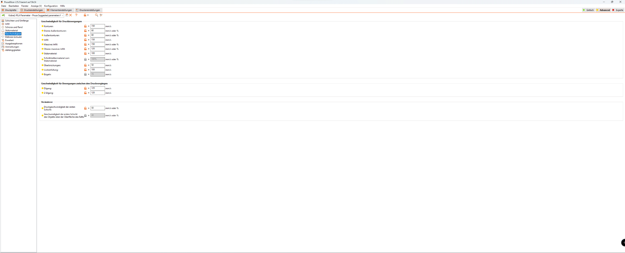 Der Kobra 2 wird mit einer 0,4 mm-Düse und PLA ausgeliefert, Anycubic empfiehlt hierfür eine Schichthöhe von 0,2 mm, die erste Schicht ist mit 0,28 mm etwas dicker und drei Wandlinien mit einer Dicke von 1,21 mm. Die Druckgeschwindigkeit liegt je nach Art der Linie zwischen 50 und 150 mm/s, letztere kommt beispielsweise bei Konturen und dem Infill zum Einsatz. Das Profil kann selbstverständlich angepasst werden, falls die Druckqualität für bestimmte Objekte noch nicht optimal ist.