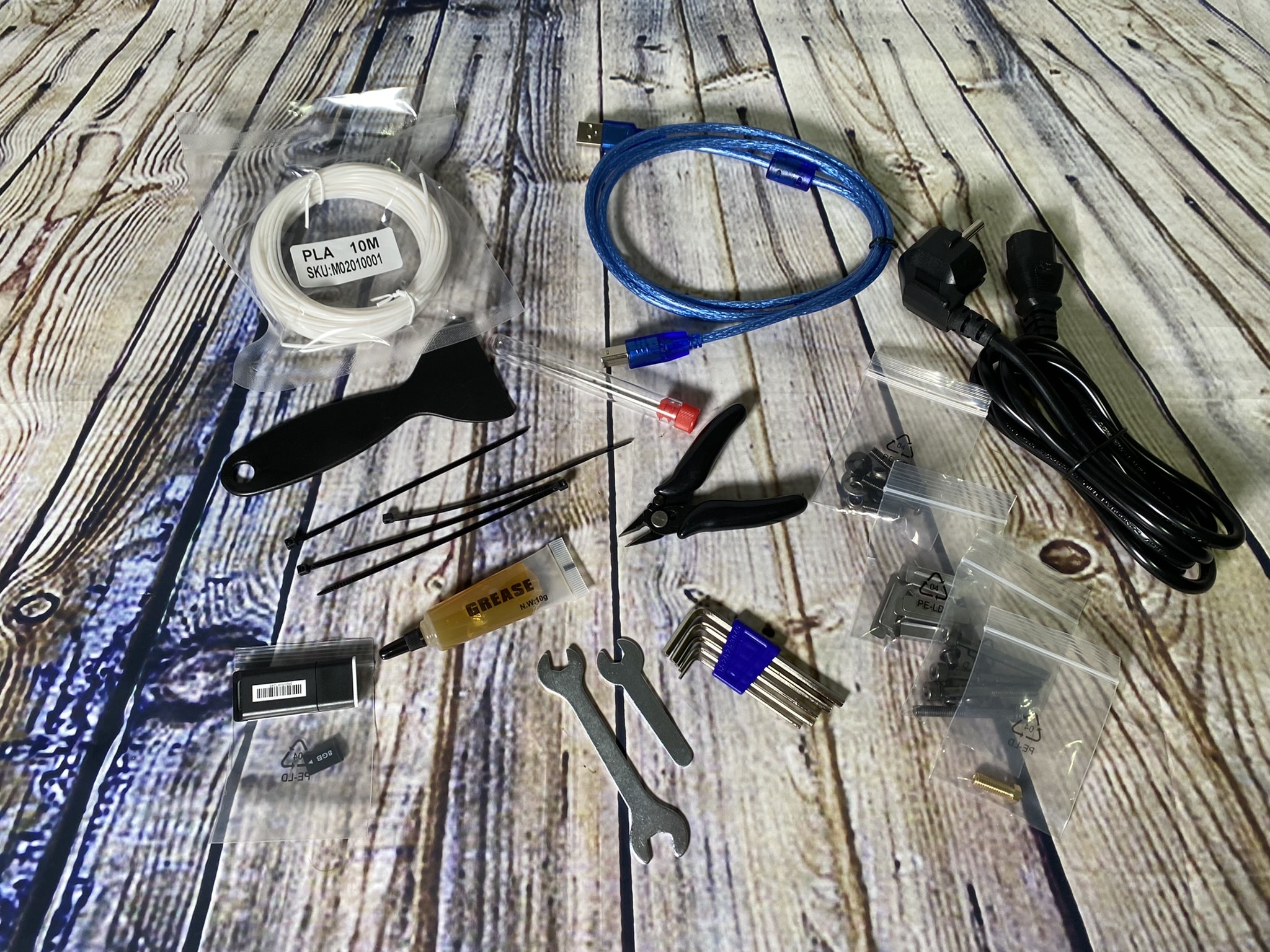 Groß in der Breite und recht flach in der Höhe wird der Kobra Max geliefert. Dabei sind die einzelnen Elemente in schwarzem, festen Schaumstoff voneinander getrennt, so dass bei der Lieferung keine Schäden entstehen können. In unseren Fall hat dies auch wunderbar funktioniert! Hat man alles aus dem Karton befreit, können wir einen Blick auf den gesamten Lieferumfang werfen. Abgesehen von dem Druckergestell selbst befinden sich im Lieferumfang ein USB-B-Kabel, Kratzer, Kneifschere, Innensechskantschlüssel und Schmierfett. Außerdem gibt es noch 10 Meter PLA, um den ersten Testdruck starten zu können.