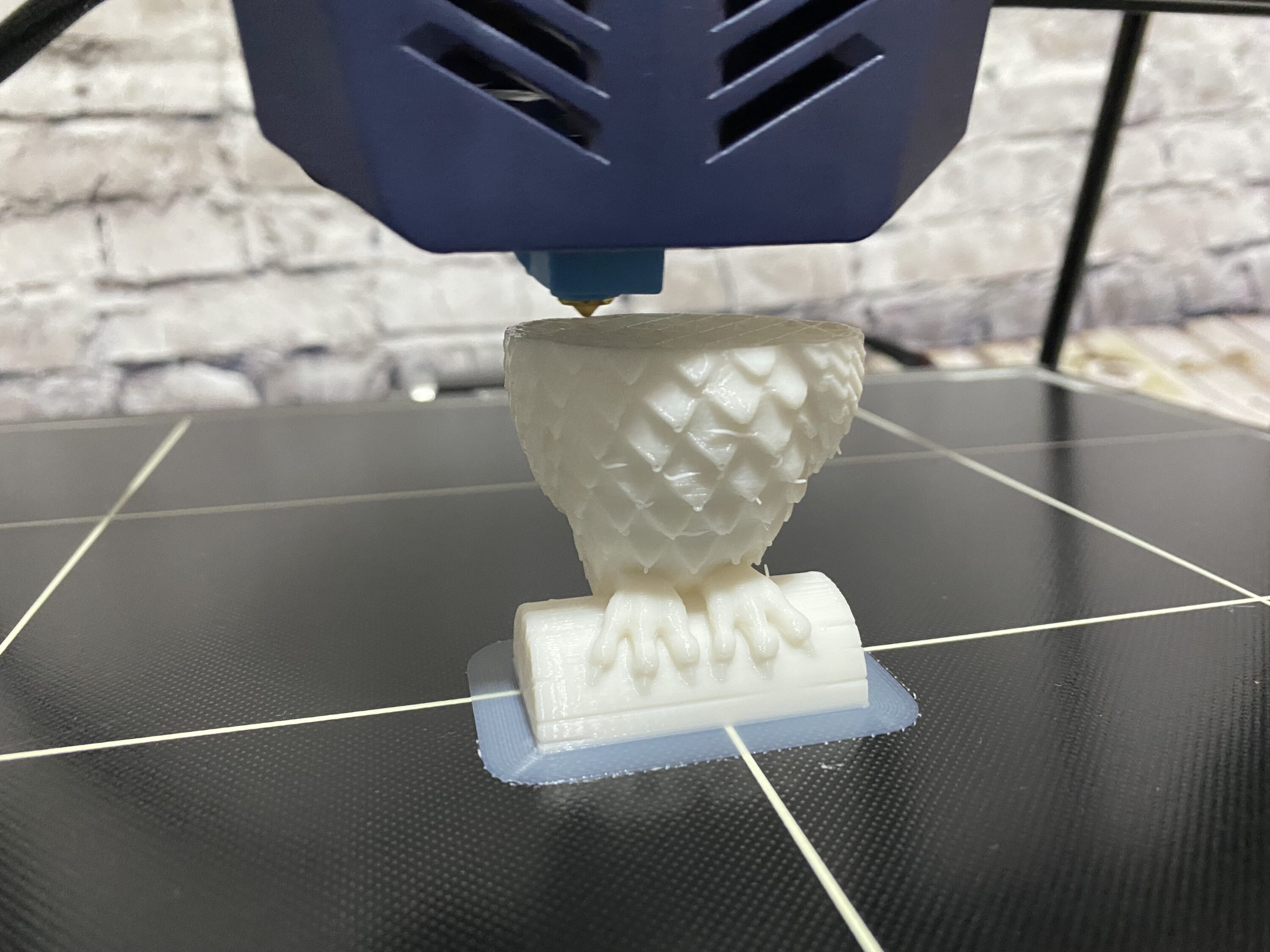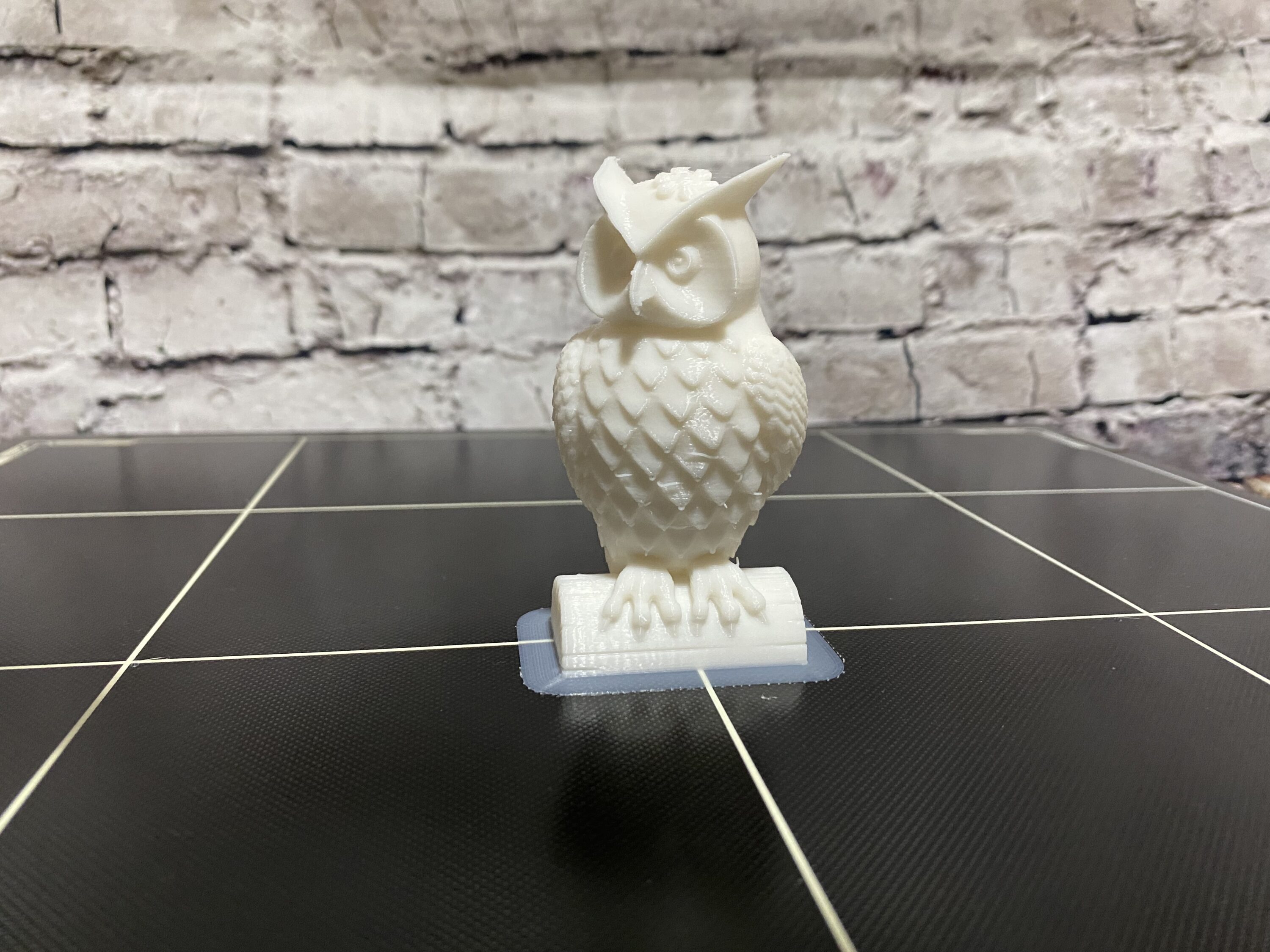 Für den ersten Druck haben wir uns die mitgelieferten 10 Meter weißen PLA zu Hand genommen und die von Anycubic schon vorher hinterlegte Testdatei ausgedruckt. Dabei handelte es sich um eine Eule, welche auf einem halben Baumstamm sitzt. An dieser kann man schließlich anhand kleinen Details einen Eindruck über die Druckqualität bekommen. Nach ungefähr einer Stunde warten war die Eule auch schon fertig. Im unserem Fall sieht das fertige Produkt schon sehr ordentlich aus. Die einzelnen Layer sind gleichmäßig aufeinander gesetzt und das Auto-Leveling hat an der Stelle einwandfrei seinen Zweck erfüllt.
