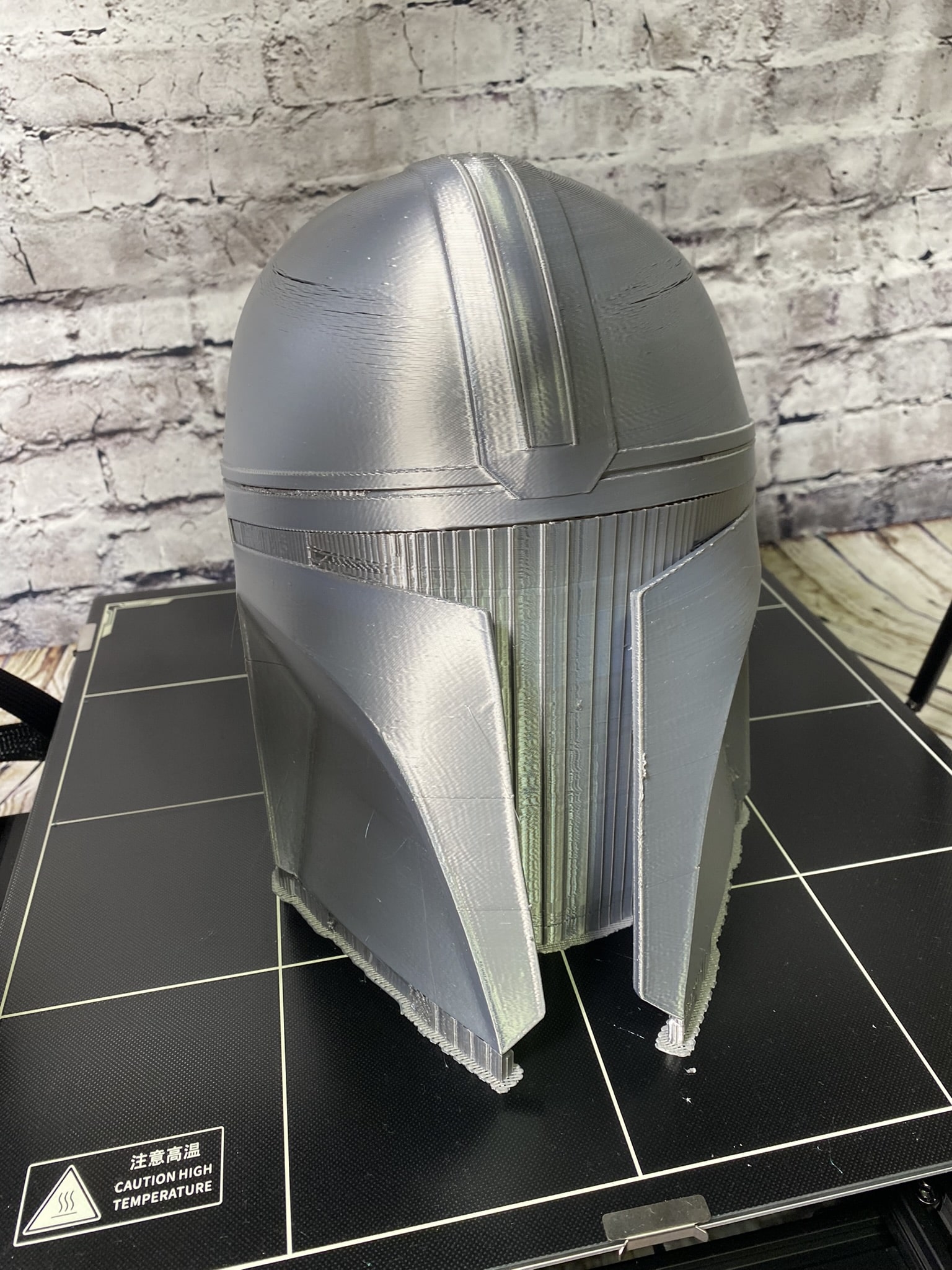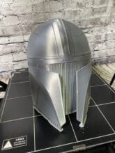 Als letzten Testdruck haben wir uns noch für einen Star Wars Mandalorian Helm entschieden. Dieser ist recht groß, füllt damit die Druckplatte schon ordentlich und kann mit einen paar handlichen Einstellungen im Slicer effizient und schnell ausgedruckt werden. Im unserem Fall haben wir es geschafft, den Helm mit rund 300 g PLA und einer Druckzeit von 16 Stunden ausgedruckt zu bekommen. Die Qualität in der Feinheit der Linien musste dadurch zwar etwas mehr leiden, jedoch ist es bei großen Modellen nicht sonderlich tragisch. Einzig etwas schade war bei uns die Materialwahl, da das PLA ziemlich klumpig gewesen ist, was wir bei unseren vorherigen Drucken nicht sehen konnten. Nichts desto trotz hat uns diese Art des Druckens besonders Spaß gemacht und ermöglicht euch sowie uns in Zukunft große Modelle mit einer vergleichsweisen sehr schnellen Druckgeschwindigkeit auszudrucken, ohne Kompromisse bei der Qualität eingehen zu müssen.