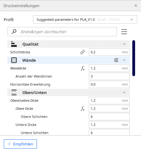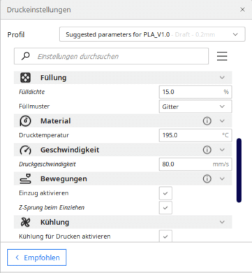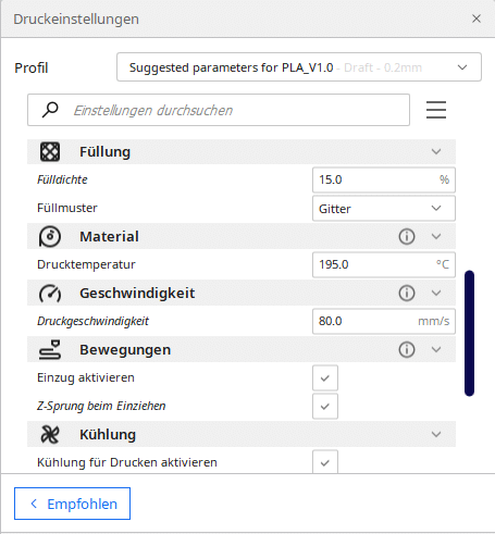 Eine Eigenschaft ist uns besonders aufgefallen, und zwar die empfohlene Druckgeschwindigkeit. Anycubic empfiehlt eine Geschwindigkeit von 80 mm/s, was deutlich schneller als bei den älteren 3D-Druckern ist. Abgesehen davon gibt es nicht viel spannendes zu den Einstellungen zu sagen. Am besten probiert man selbst aus oder schaut im Internet, dass man die richtigen Einstellungen für die zu druckende Datei findet.