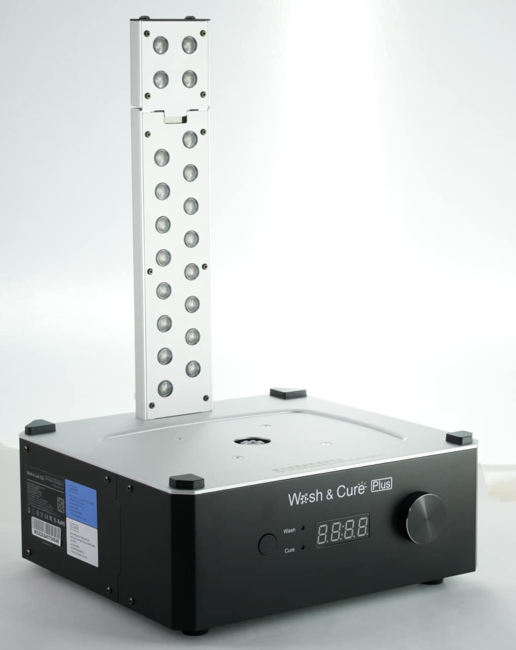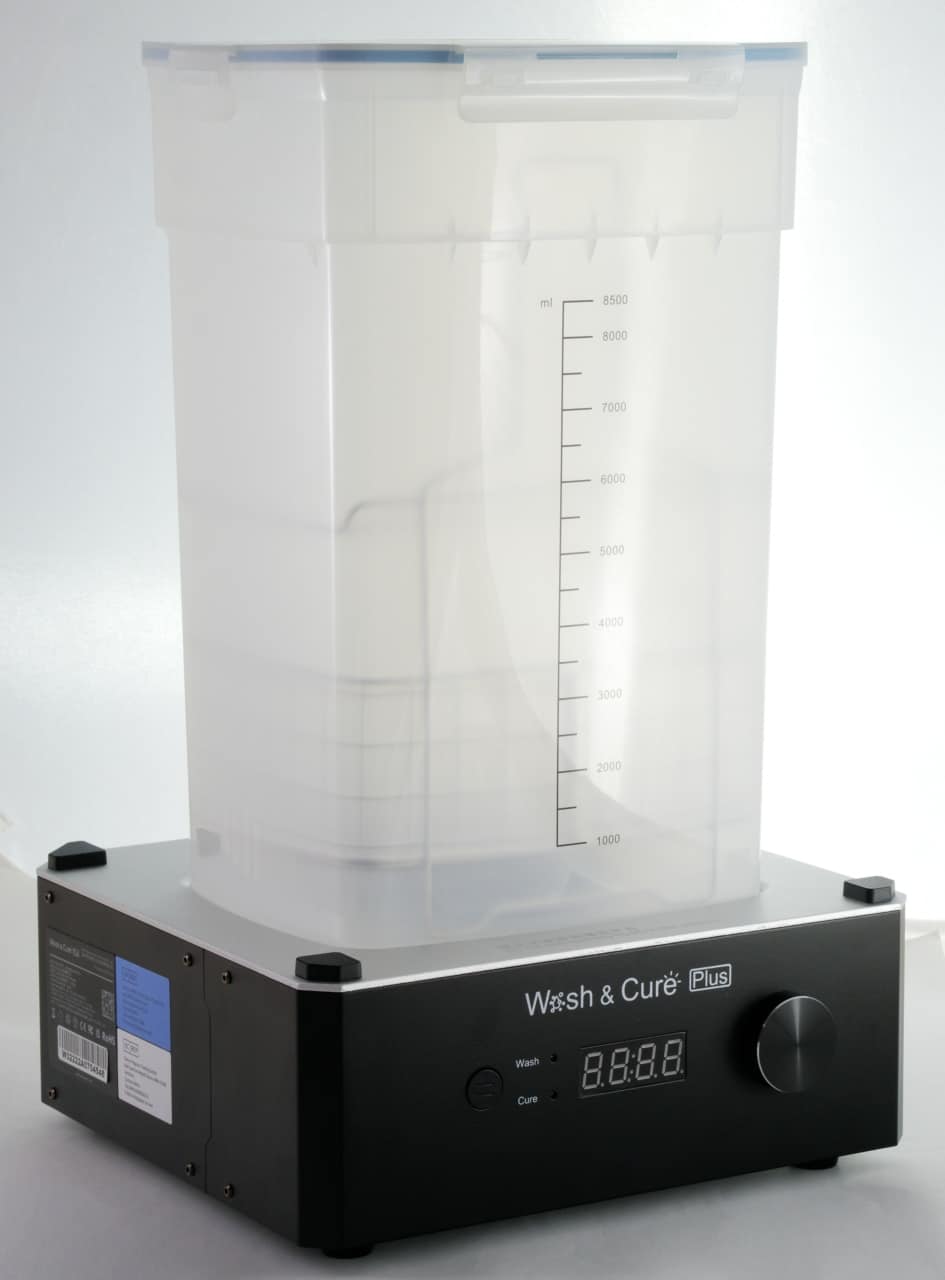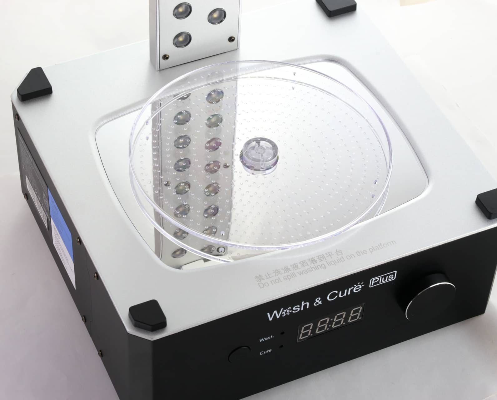 Je nach Betriebsmodus setzt der Wash and Cure Plus auf den verbauten, abknickbaren UV-LED-Turm, oder auf den mitgelieferten Waschtank. Zum Härten wird das Modell dabei auf einen Drehteller gestellt, wo es seitlich, von oben und durch eine Spiegelfolie auch von unten angeleuchtet und damit ausgehärtet wird. Beim Waschen wird hingegen über schnell rotierende Magnete eine Drehscheibe am Boden des Waschtanks bewegt. Hierdruch gibt es viel Bewegung in der eingefüllten Flüssigkeit, durch die das überschüssige Harz abgewaschen werden soll. Für einen sinnvollen Betrieb sollten dabei rund 5 bis 6 Liter eingefüllt werden – je nach Resin Wasser oder Isopropanol.