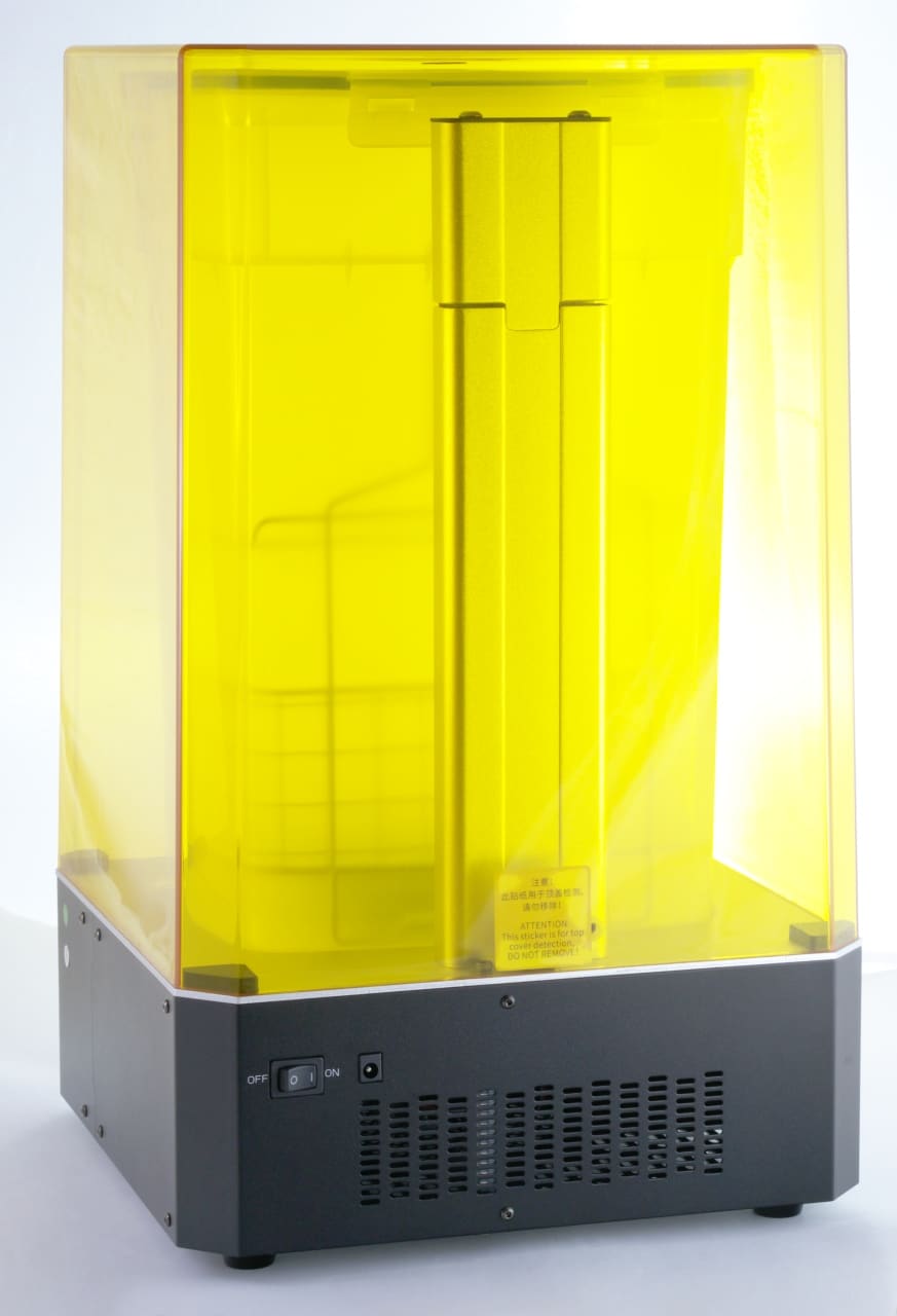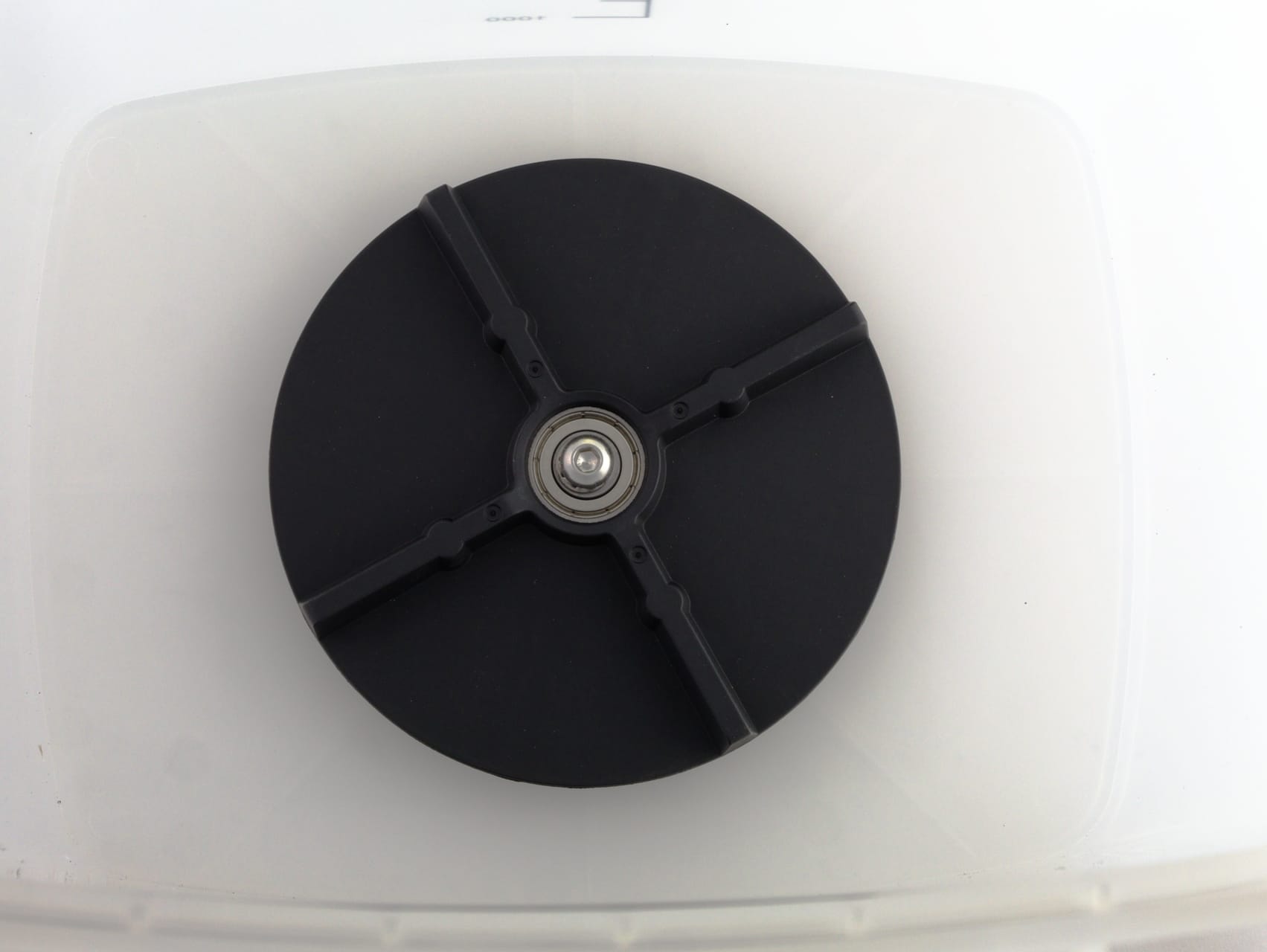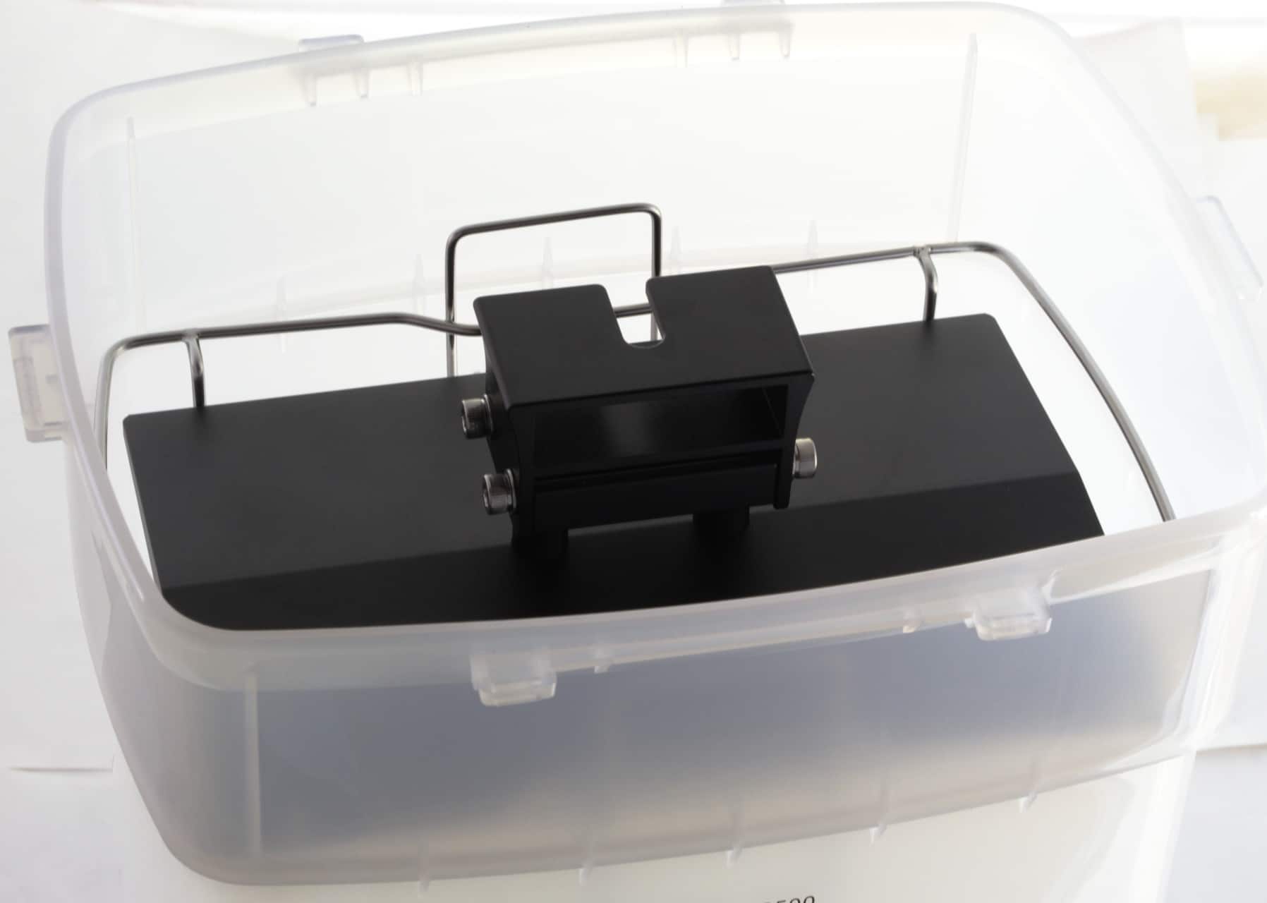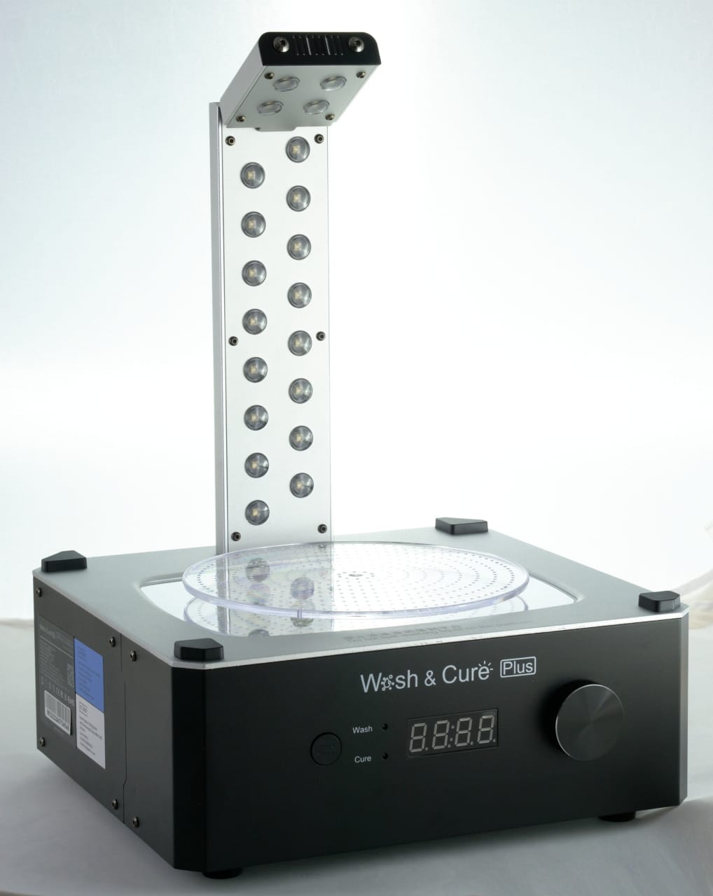 Je nach Betriebsmodus setzt der Wash and Cure Plus auf den verbauten, abknickbaren UV-LED-Turm, oder auf den mitgelieferten Waschtank. Zum Härten wird das Modell dabei auf einen Drehteller gestellt, wo es seitlich, von oben und durch eine Spiegelfolie auch von unten angeleuchtet und damit ausgehärtet wird. Beim Waschen wird hingegen über schnell rotierende Magnete eine Drehscheibe am Boden des Waschtanks bewegt. Hierdruch gibt es viel Bewegung in der eingefüllten Flüssigkeit, durch die das überschüssige Harz abgewaschen werden soll. Für einen sinnvollen Betrieb sollten dabei rund 5 bis 6 Liter eingefüllt werden – je nach Resin Wasser oder Isopropanol.
