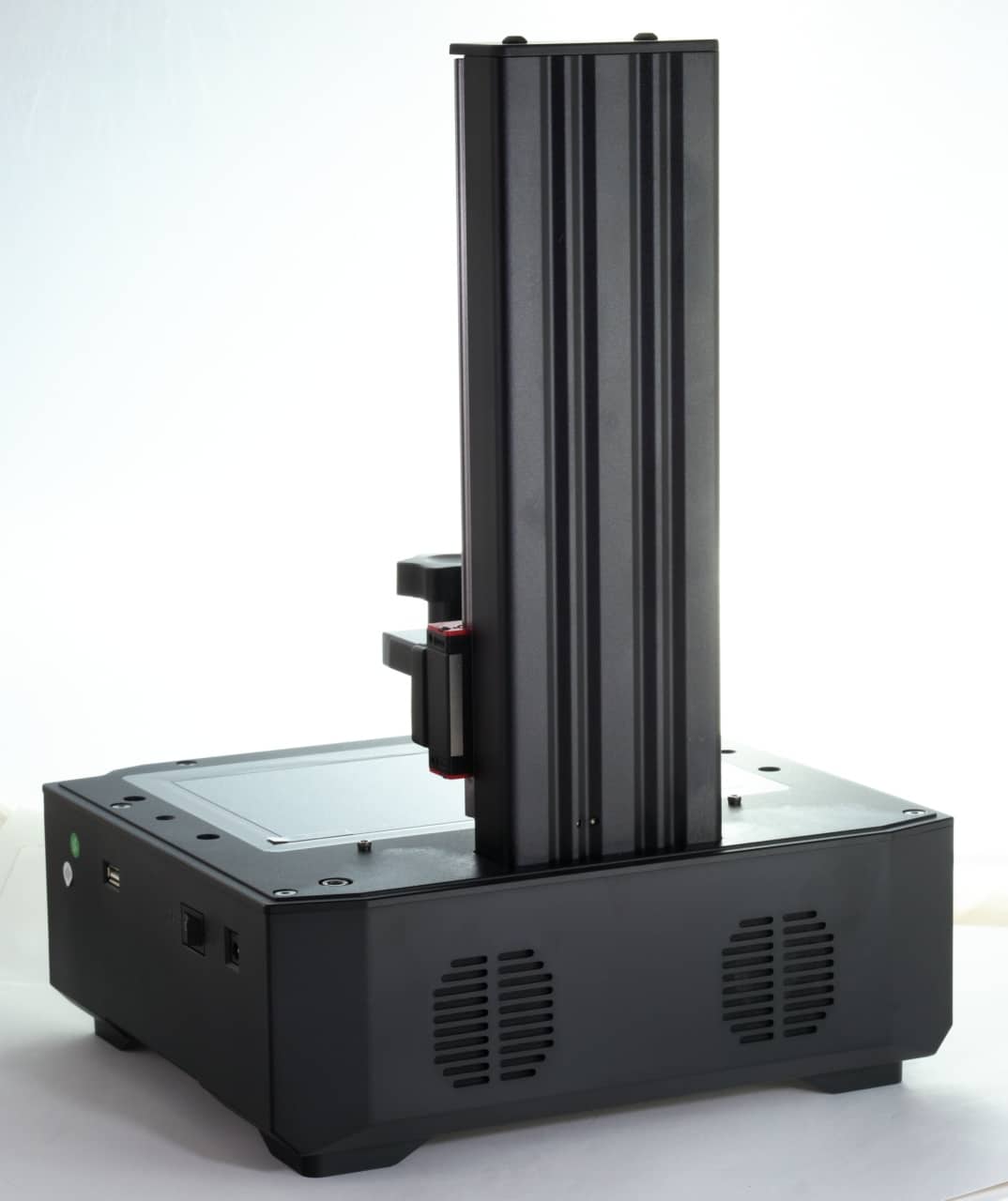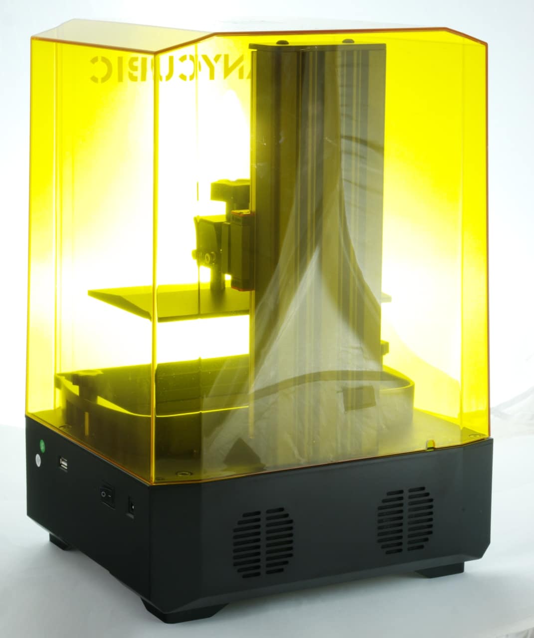 Beim grundsätzlichen Aufbau wagt Anycubic keine Experimente: Wie bei anderen SLA-Druckern sitzt die gesamte Elektronik auch hier in einer Basis, aus der oben das für das Drucken wichtige LCD-Display ragt. Auf diesem findet wiederum der Harztank Platz, aus dem später mit zwei Linearschinen und einer Gewindestange die Druckplatte herausgezogen wird.