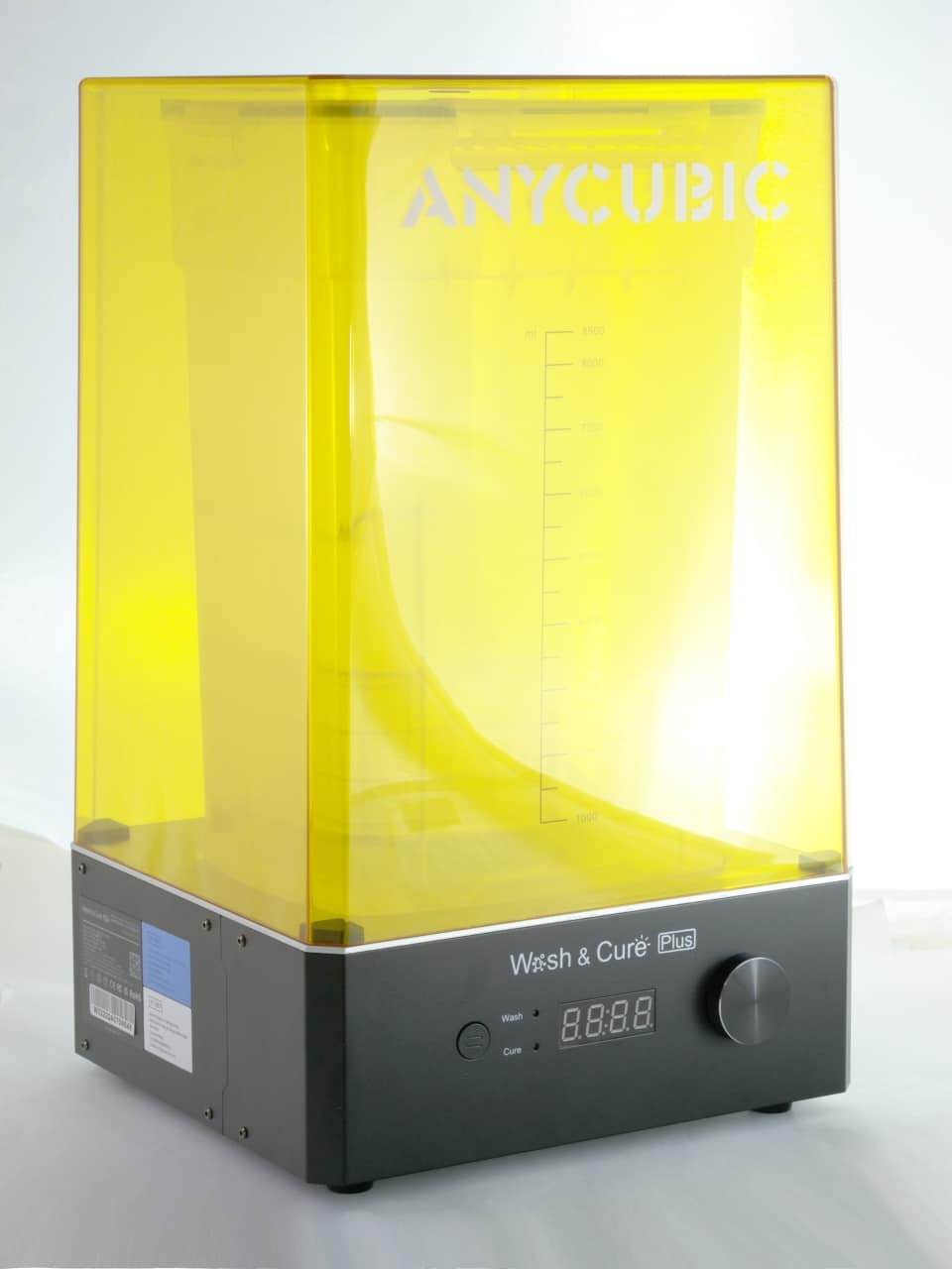 Bevor wir zum Fazit kommen, wollen wir zum Abschluss noch einen kurzen Blick auf ein Gerät werfen, das sich gut für die Zusammenarbeit mit dem Photon Mono X2 eignet: Den Anycubic Wash and Cure Plus. Wie es der Name bereits andeutet, dient dieser zum Reinigen und Aushärten der Modelle, wobei erneut ein dem 3D-Drucker ähnlicher Aufbau zum Einsatz kommt. Wieder sitzt die Elektronik in einem Basisgehäuse, auf dem statt einer Z-Ache und eines Resin-Tanks eine eingelassene Arbeitsfläche und ein Turm mit UV-LEDs untergebracht sind.