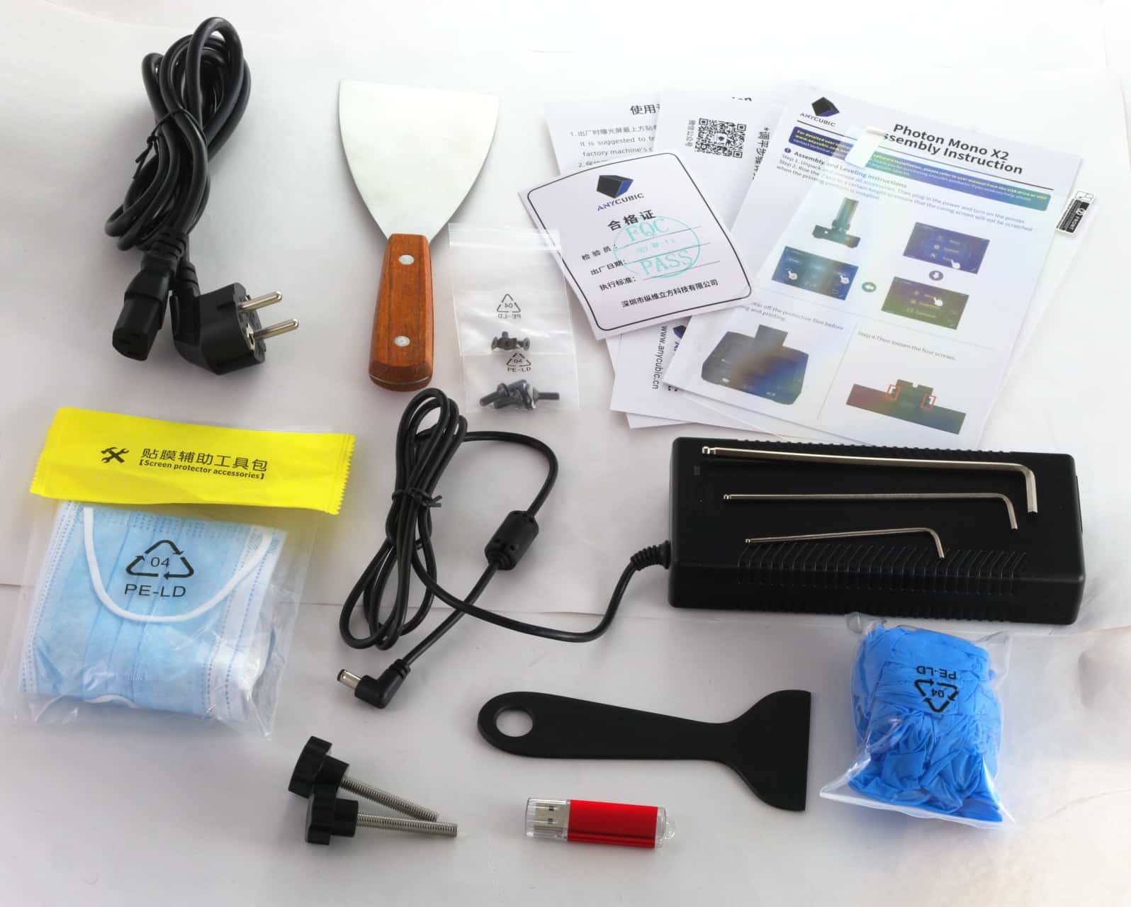 Der Anycubic Photon Mono X2 wird in einem schlichten Karton geliefert, in dessen Innerem sich der bereits fast vollständig aufgebaute 3D-Drucker befindet. Neben dem Gerät selbst zählen zu den direkt zum Betrieb notwendigen Komponenten dabei ein externes Netzteil samt Anschlusskabel, ein USB-Stick mit 4 GB und der Resin-Tank sowie die Buildplate.