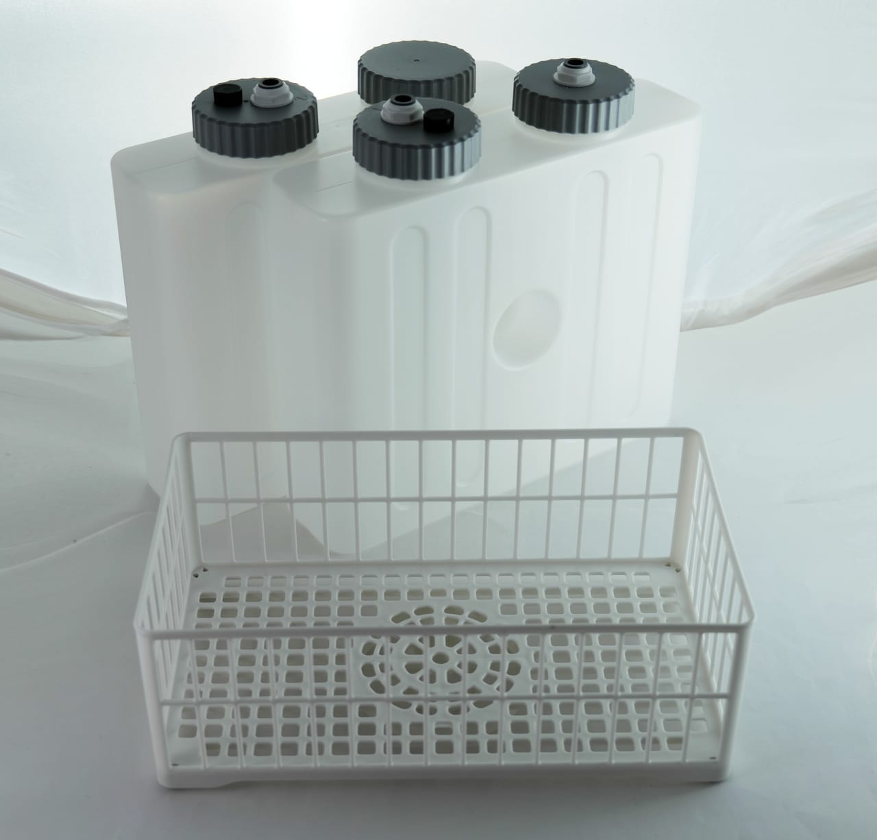 Sobald die Schläuche verbunden und alle Behälter neben dem Gerät positioniert sind, muss man abschließend nur noch den Käfig auf den Rotor im Reinigungsraum setzen. Damit ist der Aufbau – nach wenigen Minuten – abgeschlossen, und das Gerät kann verwendet werden.
