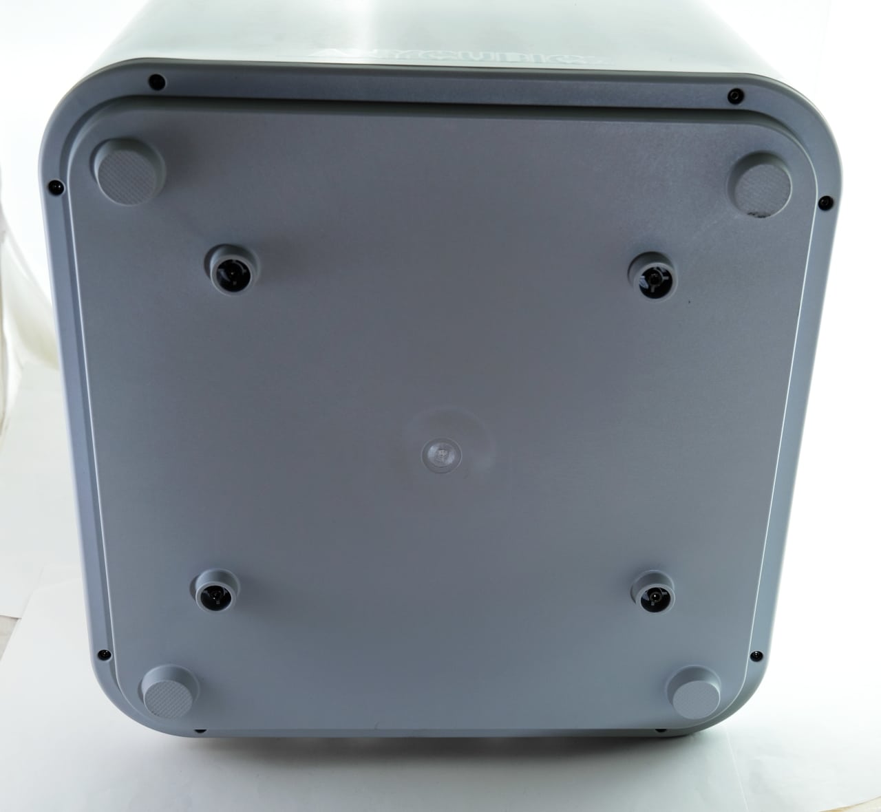 Auch an der Unterseite des Wash & Cure Max gibt es nicht viel zusehen. Dort besteht das Gehäuse aus grauem Kunststoff, der zudem auch gleich die vier Standfüße ausformt. Dasselbe Material kommt auch am Rand der Oberseite zum Einsatz, wo er den semi-transparenten Deckel der Waschstation umfasst. Dieser kann leicht angehoben werden, wodurch der Blick ins Innere frei wird.