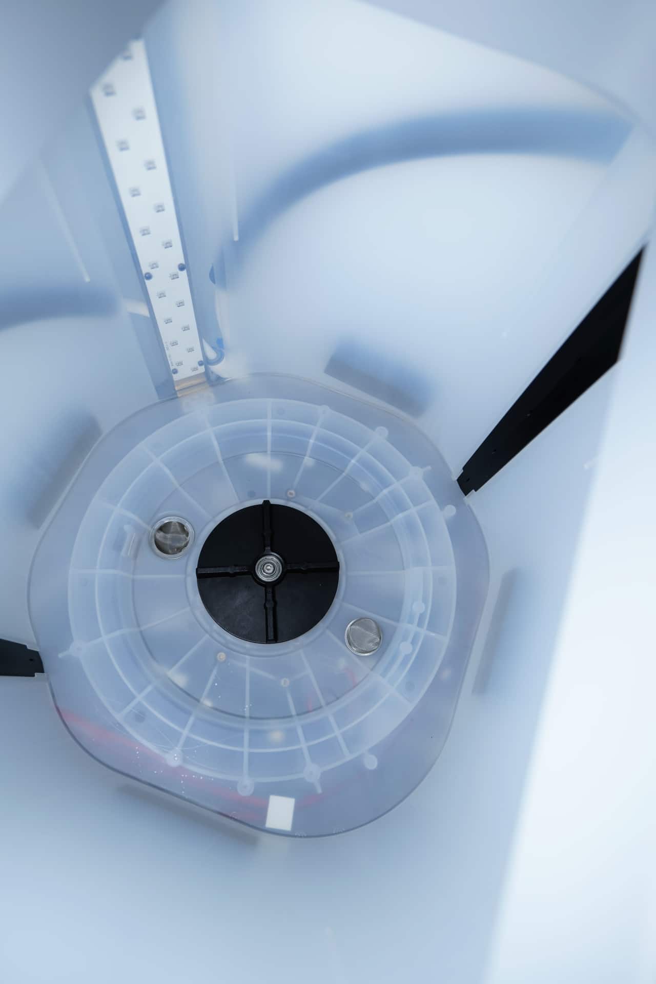 Dort trifft man den eigentlichen Waschraum an, der aus transluzentem Kunststoff besteht. Die Flüssigkeiten werden dabei seitlich über Düsen eingespritzt, die am Boden durch austauschbare Filter abfließen können. Die Härtung erfolgt hingegen durch einen Streifen UV-LEDs. Damit die Modelle dabei von allen Seiten gewaschen beziehungsweise angestrahlt werden, befindet sich am Boden zudem eine Drehscheibe, wie man sie bereits von den anderen Wash-&-Cure-Maschinen kennt. Sie rotiert im Betrieb den Waschkäfig und damit auch die 3D-Modelle.