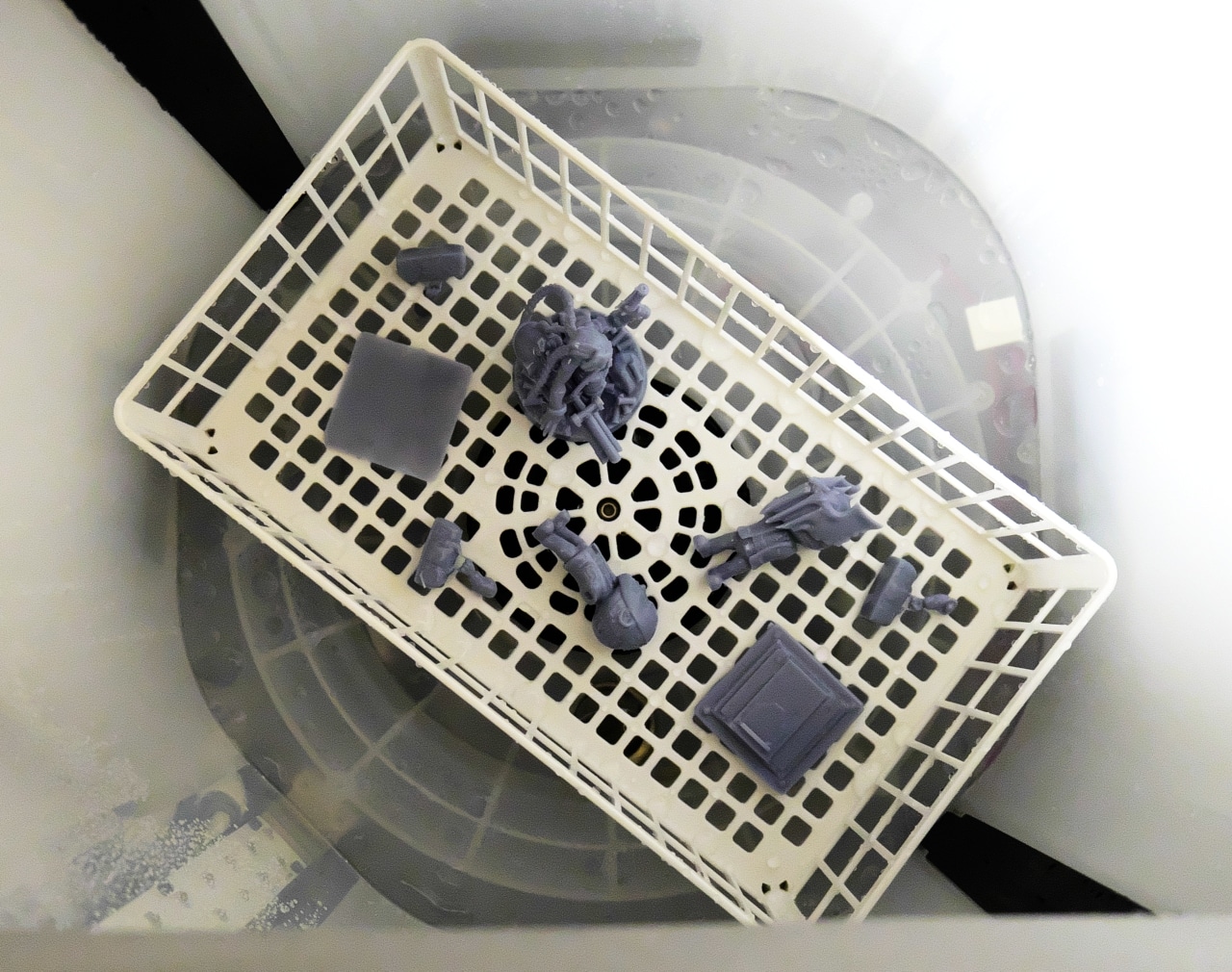 Auch Anycubics Versprechen, dass der Wash & Cure Max mit nur wenig Isopropanol auskommt, können wir bestätigen. Diesen Vorteil verkauft man aber durch einen vergleichsweise hohen Wasserverbrauch, der insbesondere mit Hinblick auf die Entsorgung bedacht werden sollte. Zudem kann man Gerät leider nur mit Modellen verwenden, die nicht zu klein sind. Denn diese würden – ohne weiteres Zubehör – durch den Waschkorb fallen.