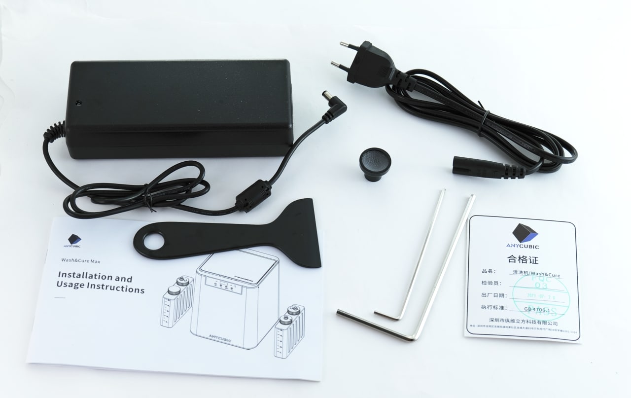 Anycubic liefert den Wash & Cure Max in einem unbedruckten Pappkarton aus. Darin befindet sich, von dicken Schaumstoffpolstern geschützt, das fertig aufgebaute Gerät. Das Zubehör ist wiederum in diesem verstaut: In einer Schaumstoffeinlage sind die Anleitungen, ein Kunststoffspachtel, ein Ersatzfilter, zwei Inbusschlüssel und das externe 24V-Netzteil untergebracht. Darunter, im Hauptraum der Waschstation, lassen zudem der Bauteilkäfig, zwei Flüssigkeitstanks, ein faltbarer Kunststoffeimer und vier Schläuche mit einer Länge von rund 1,5 m finden. Damit wird sämtliches Zubehör bereitgestellt, das man zur Inbetriebnahme benötigt.
