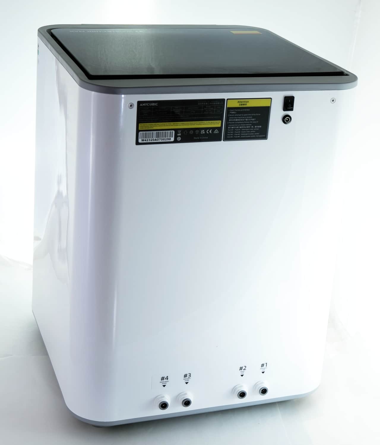 Der Aufbau des Anycubic Wash & Cure Max geht schnell von der Hand. Zunächst stellt man das Gerät an die gewünschte Position. Danach montiert man der Rückseite die vier ab Werk nummerierten Schläuche, indem man sie einfach in die entsprechenden Öffnungen schiebt. Dort rasten sie dann selbstständig ein.