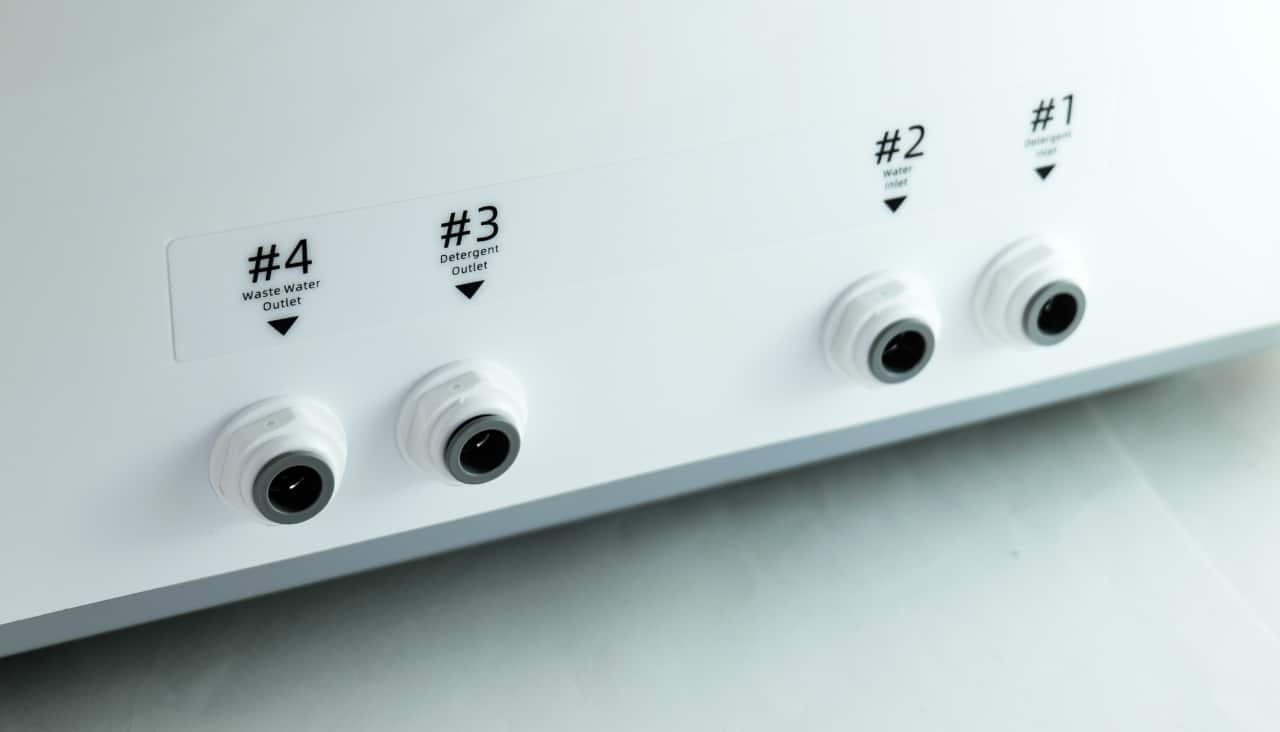 Während links und rechts nur Schrauben zur Befestigung des Gehäuses zu sehen sind, wird es an der Rückseite noch einmal interessant: Dort sind vier Schlauchanschlüsse untergebracht, durch die das Gerät Reinigungsmittel und Wasser sowie die Restflüssigkeit an- bzw. abpumpen kann.