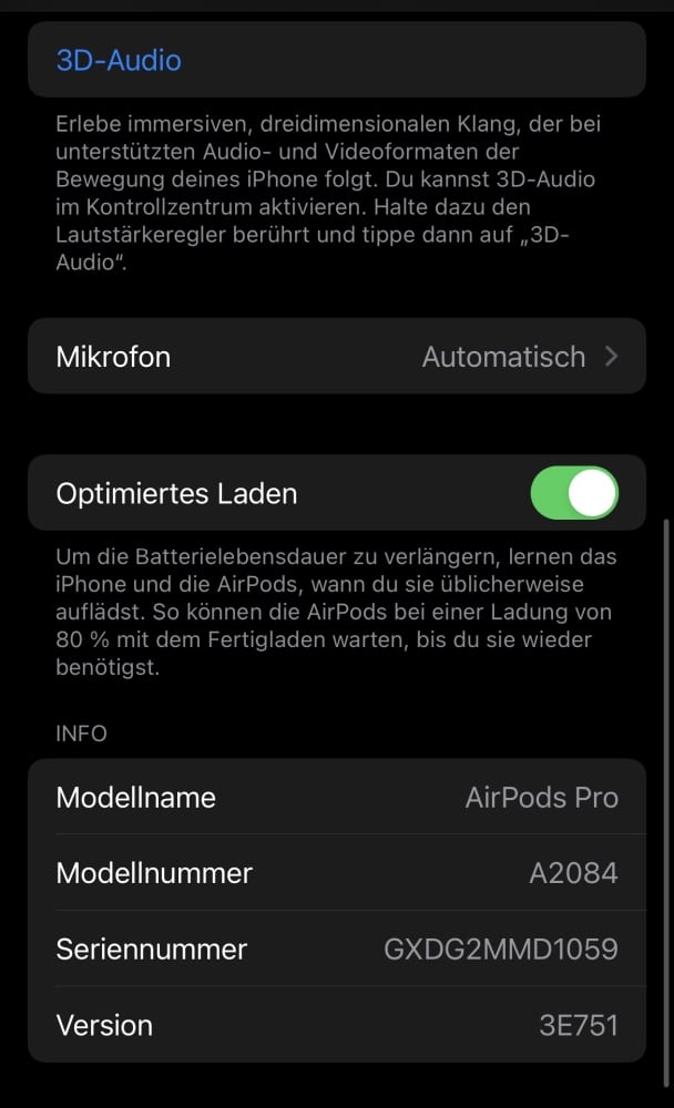 | Besonderheiten | Kabelloses Laden (Qi und MagSafe); Spatial Audio |