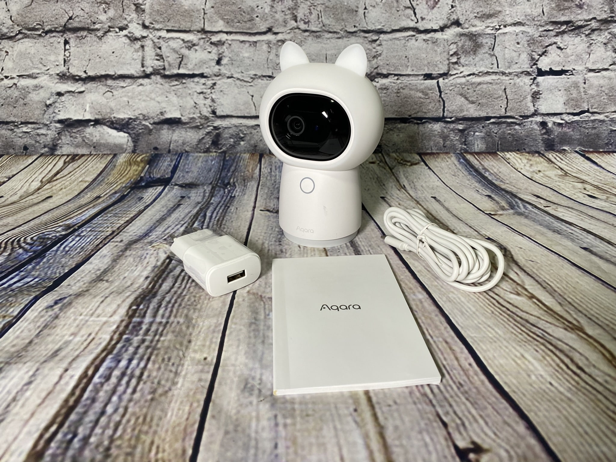 In einem sparsam verpackten weißen Karton wird die Aqara Camera Hub G3 angeliefert. Auf der Verpackung befindet sich auf der Vorderseite das Produktbild der Camera Hub und auf der Rückseite eine große Auflistung an Funktionen dieser. Befreit man alles vom Karton, erhält man abgesehen von der Camera Hub noch ein USB-C-zu-USB-A-Kabel, ein 10W-USB-Netzteil und eine Bedienungsanleitung. Eine optionale, verniedlichende Silikonkappe ist schon an der Camera Hub befestigt, die dieser kleine Öhrchen verpasst.