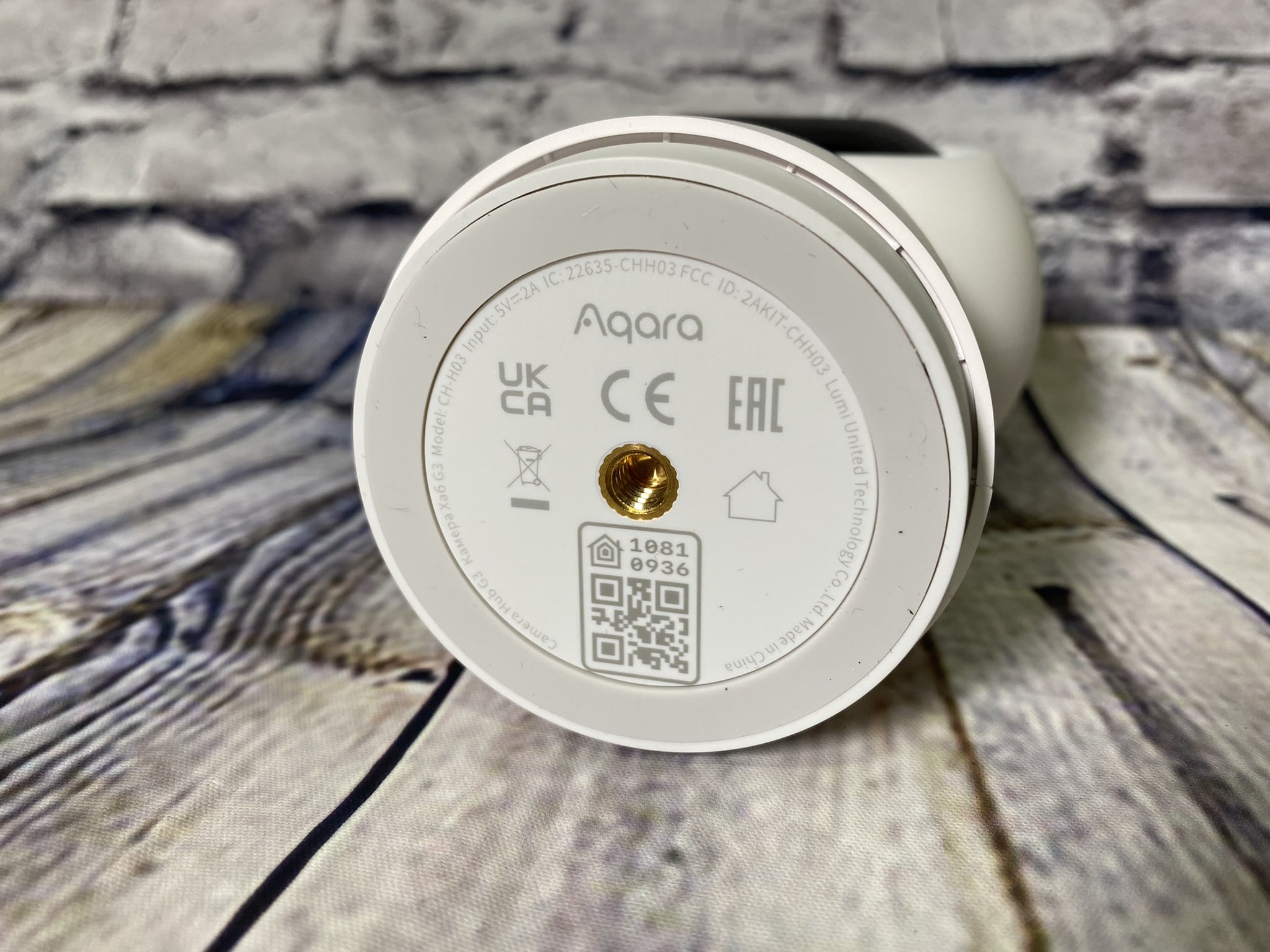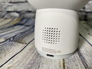 Unterm Kopf selbst befindet sich ein kleiner LED-Ring, welcher Grün/Gelb leuchten kann und zur Konfiguration dient. Auf der Rückseite des Objektivkopfs ein kleiner Slot für die MicroSD-Karte. Unterhalb dessen auf der restlichen sichtbaren Rückseite befinden sich noch kleine Löcher für den verbauten Lautsprecher und am Boden der USB-C-Anschluss für die Stromversorgung der Camera Hub G3. Zuletzt haben wir noch die Standfläche der Kamera, auf dieser befindet sich ein Gewinde für eine Wandhalterung und ein QR-Code für die App. Kleine Zusatzinfo zuletzt: die Camera Hub G3 ist für eine Betriebstemperatur von -10 bis 40 °C ausgelegt und hält eine Luftfeuchtigkeit von 95 % aus, ist aber nicht wasserdicht und nur für den häuslichen Betrieb geeignet. Die Verarbeitung der kleinen Kamera passt, die einzelnen Elemente sitzen fest und lassen keinen Platz für Spielraum.