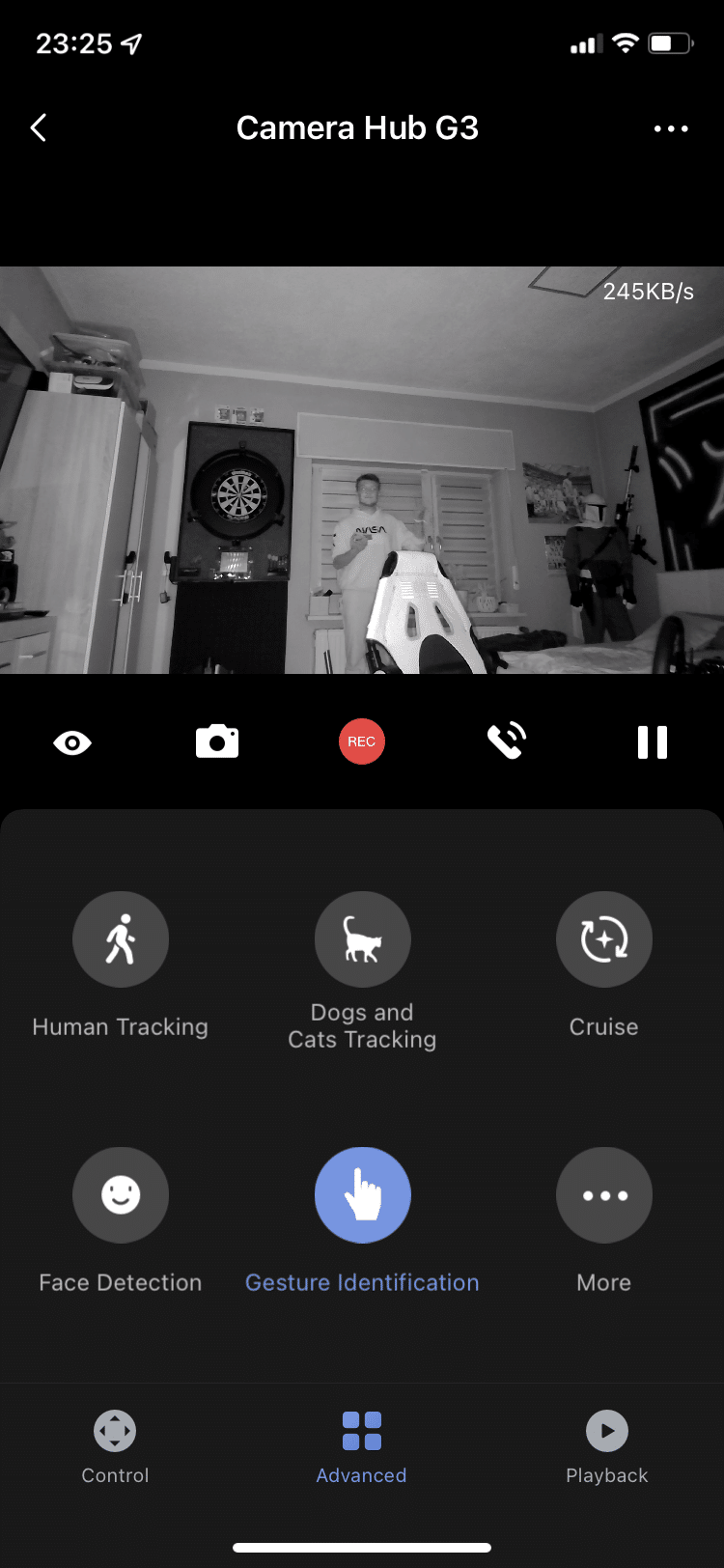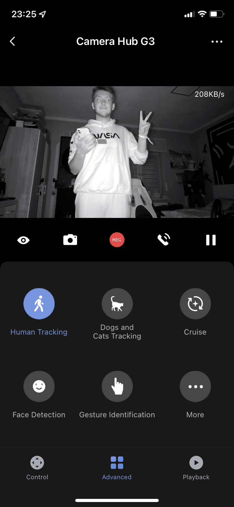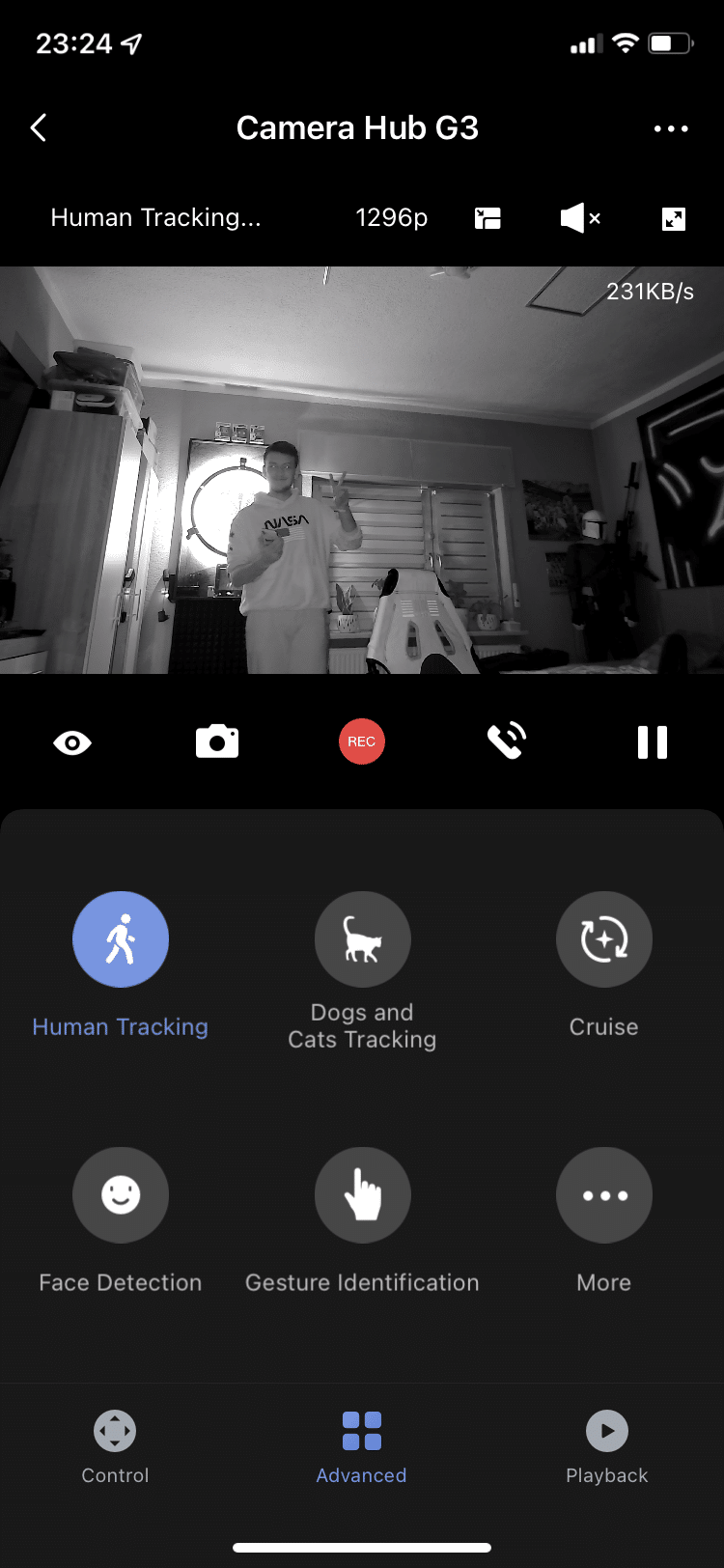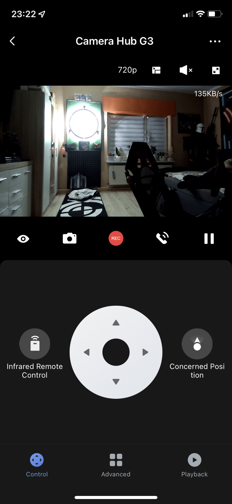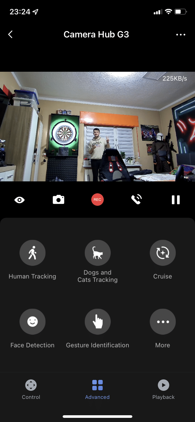 Wenn man schon beim Thema Schlafen ist: die Camera Hub G3 bietet eine Nachtsicht-Funktion an. In der dunklen Wohnung lassen sich nahe Gegenstände oder Gesichter gut erkennen. Alles, was sich etwas weiter im Hintergrund befindet, wird zwar zu Pixelbrei, aber es lassen sich noch eindeutige Konturen erkennen. Tagsüber macht die Kamera einen soliden Eindruck. Die 2K-Auflösung sieht in der Wiedergabe ordentlich und ruckelfrei aus. Somit ist diese auch als Webcam für den eigenen PC geeignet.