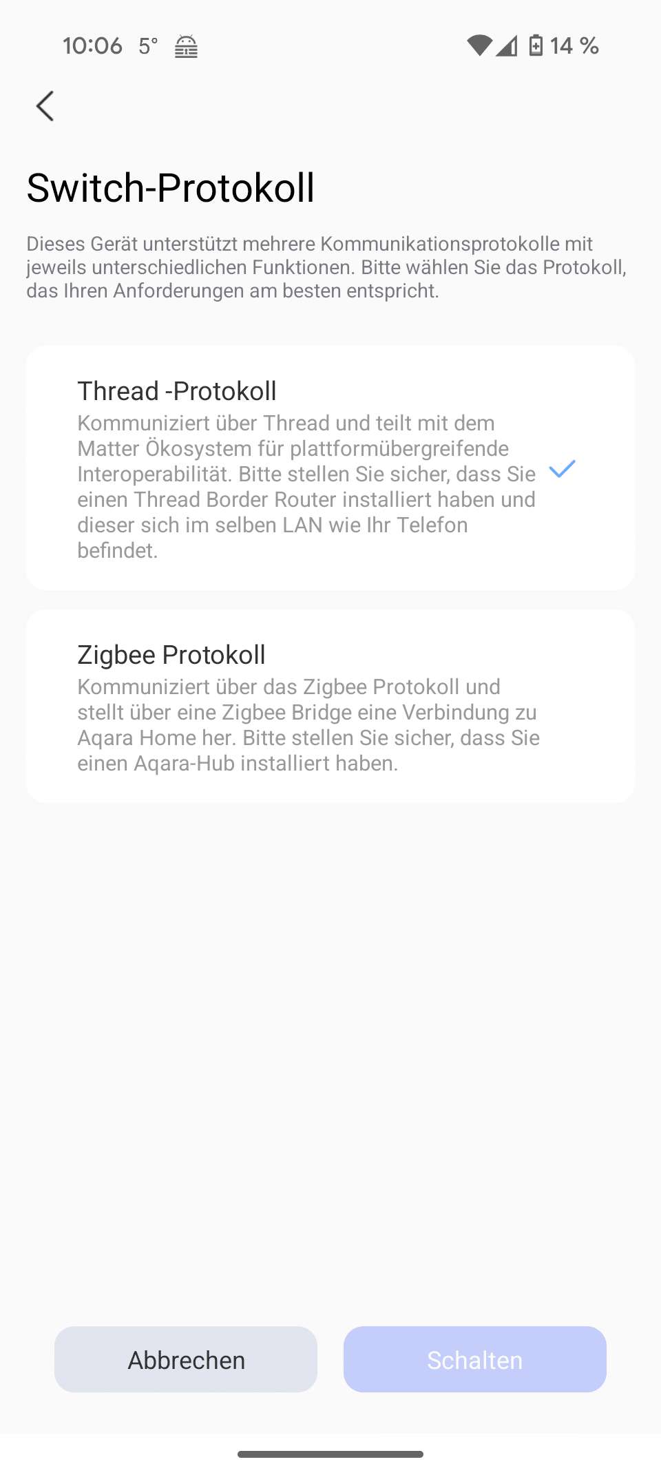 Der Thread-Modus, der standardmäßig ausgewählt ist, empfiehlt sich vor allem dann, wenn ihr den Lichtschalter direkt in Dritthersteller-Systeme integrieren wollt. Wohingegen der Zigbee-Modus mehr Features bietet und sich an Besitzer des Aqara Hubs richtet.
