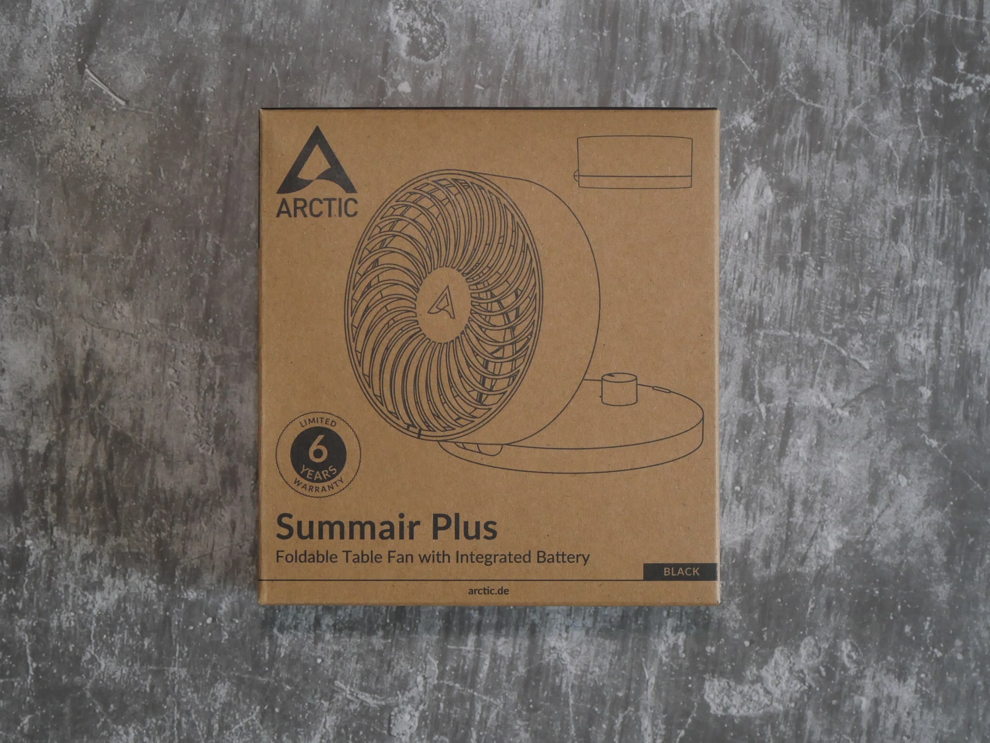 Der Arctic Summair Plus kommt in einem kompakten braunen Karton. Auf der Vorderseite findet man eine Zeichnung des Lüfters, weiter verweist Arctic noch einmal auf den Akku, die Farbe und 6 Jahre Garantie. Auf der Rückseite findet man zudem die technischen Daten des Ventilators und einen QR-Code, der zum Handbuch führt.