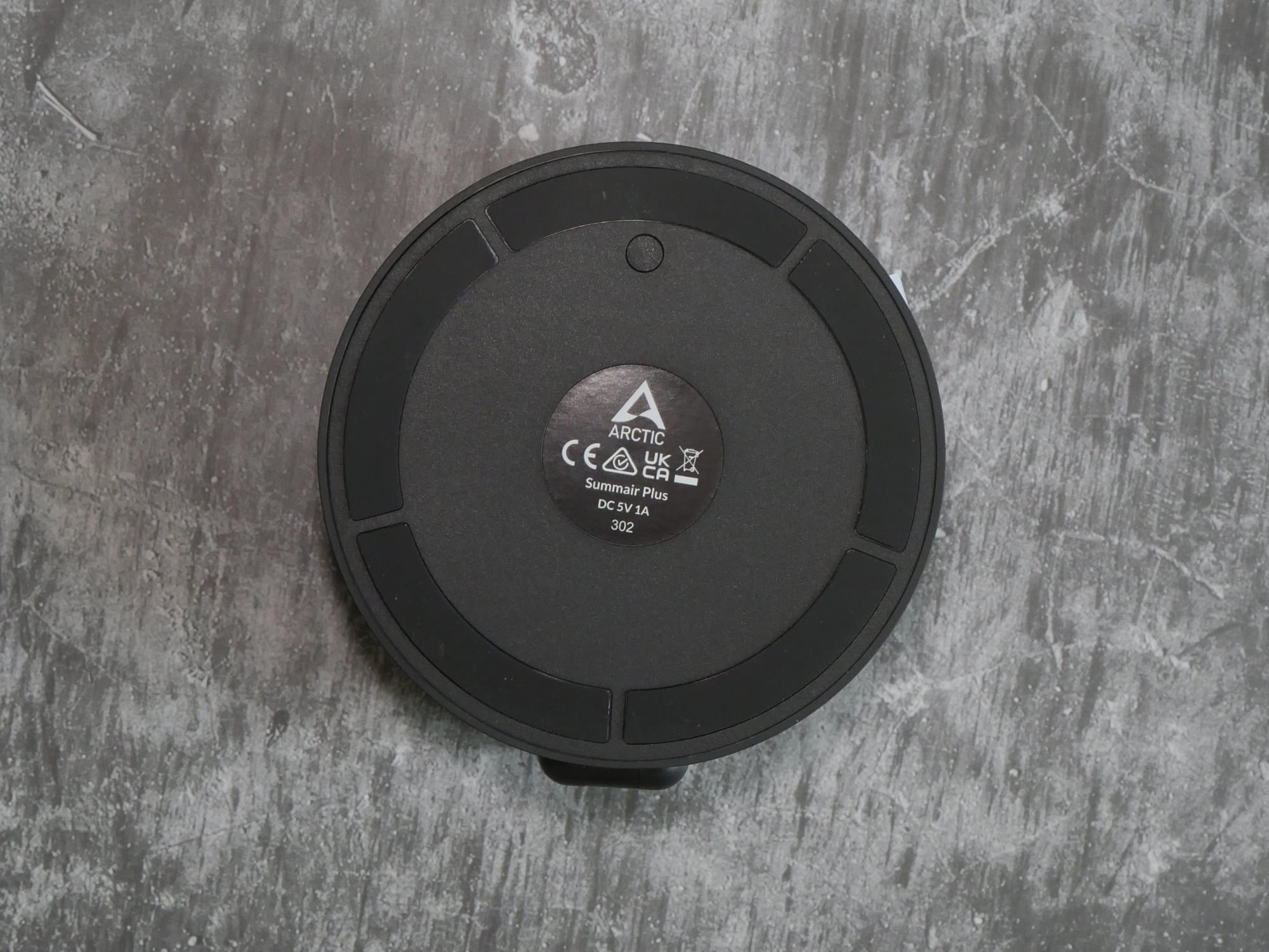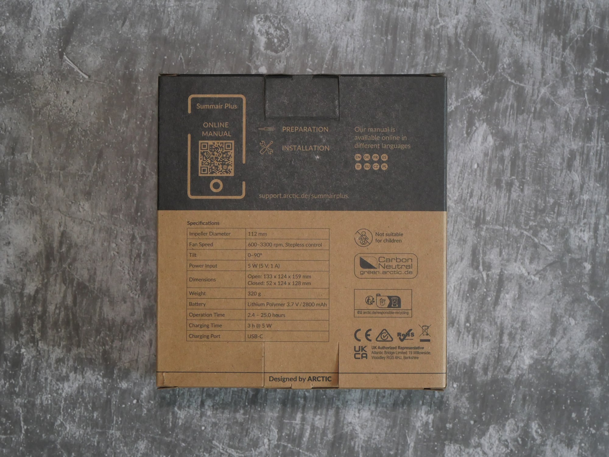 Der Arctic Summair Plus besitzt ein Lüfterrad mit einem Durchmesser von 112 mm. Die Geschwindigkeit des Lüfters kann manuell zwischen 600 und 3.300 rpm geregelt werden. Die Stromversorgung des Ventilators erfolgt über einen 2.800 mAh fassenden Akku, der über USB-C geladen wird. Das Kabel ist abnehmbar.