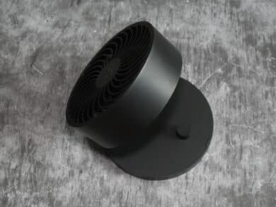 Der Luftstrom des Summair Plus ist bei geringster Geschwindigkeit nur sehr schwach, mit steigender Geschwindigkeit wird dieser aber deutlich spürbar. Auch die Lautstärke steigt mit der Geschwindigkeit deutlich an. Bei niedriger Drehzahl ist der Ventilator leise aber stets wahrnehmbar, bei maximaler Drehzahl ist er sehr laut und störend. In der Praxis stellt der mittlere Drehzahlbereich einen guten Kompromiss dar. Das Ein- und Ausschalten per Regler finden wir gelungen, da wir so nur ein einziges Bedienelement für alles benötigen. Der Regler ist auch bei stärkerer Neigung des Lüfters gut erreichbar und auch die offene Rückseite des Lüfters stellte im Test kein Problem dar. Diese ist wohl eher in Haushalten mit kleineren Kindern oder auch neugierigen Tieren problematisch.