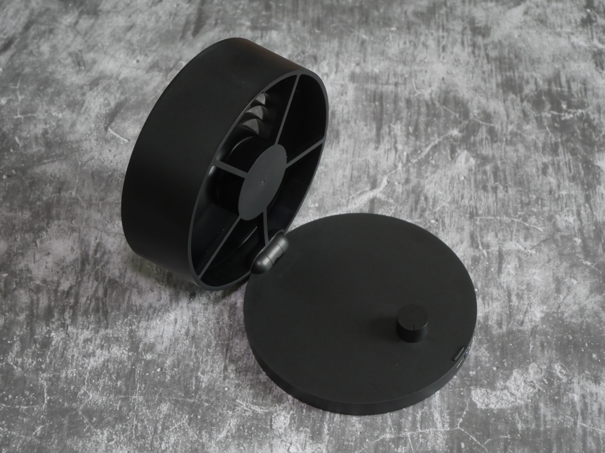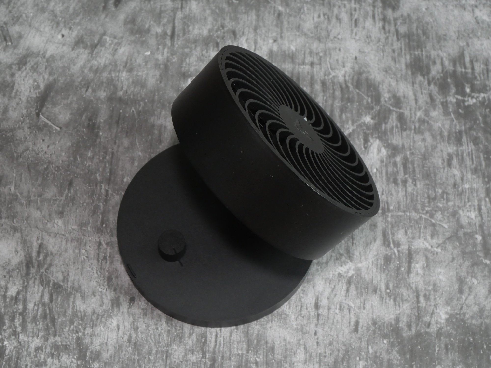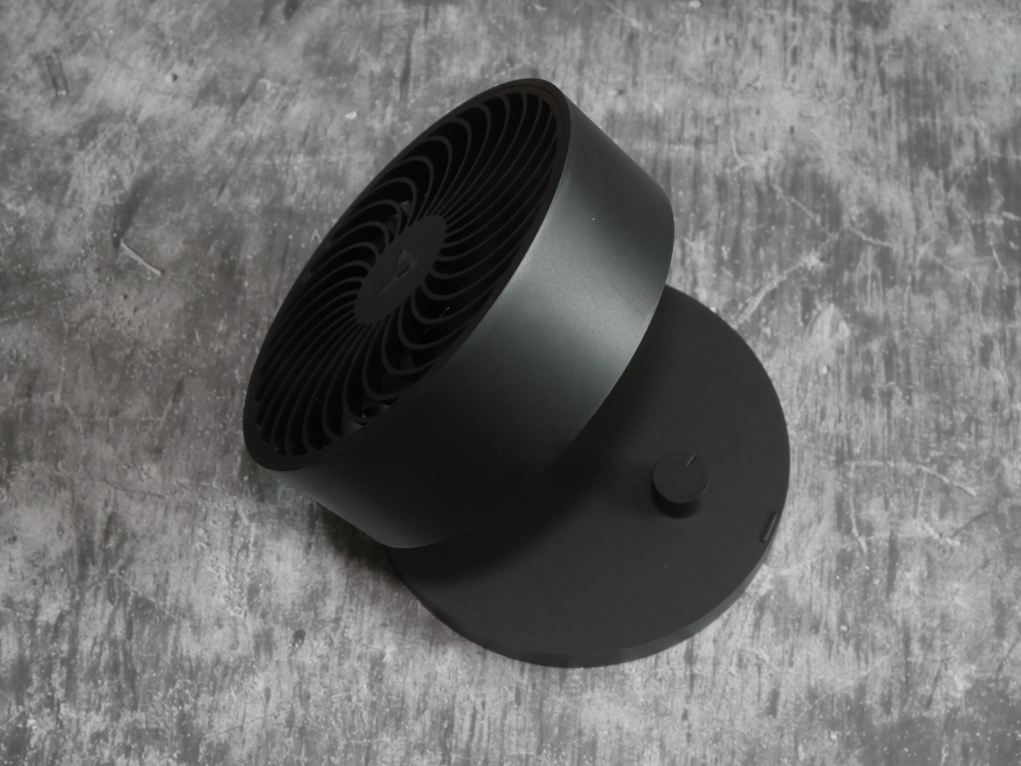 Der neigbare Lüfter ist über ein Scharnier mit dem Standfuß verbunden. Dieses ermöglicht eine Neigung von 0 bis 90° und wirkt sehr stabil. Der Lüfter bleibt dauerhaft im eingestellten Winkel. Auf der gegenüberliegenden Seite des Scharniers befinden sich der USB-C-Anschluss und drei LEDs, die den Akkustand signalisieren. Ein Drehregler dient als Ein- und Ausschalter sowie zur Anpassung der Lüftergeschwindigkeit. Auf der Unterseite des Standfußes befinden sich zudem rundherum Gummierungen, die ein Verrutschen des 320 g schweren Ventilators verhindern.