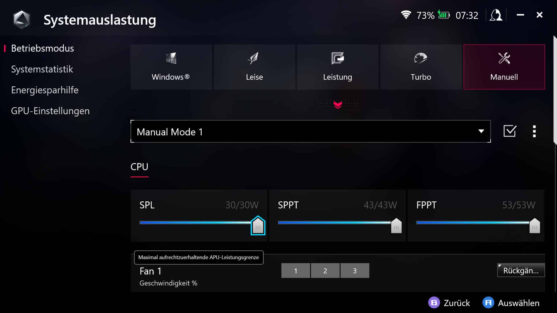 Die maximale Leistungsaufnahme liegt, im Turbo-Modus, bei 25 Watt im Akkubetrieb beziehungsweise 30W mit angeschlossenem Netzteil. Alternativ kannst du auch zwischen den Modi Leise (10 Watt) oder Leistung (15 Watt) wählen und sogar manuell an Leistung und Lüfterdrehzahl schrauben.