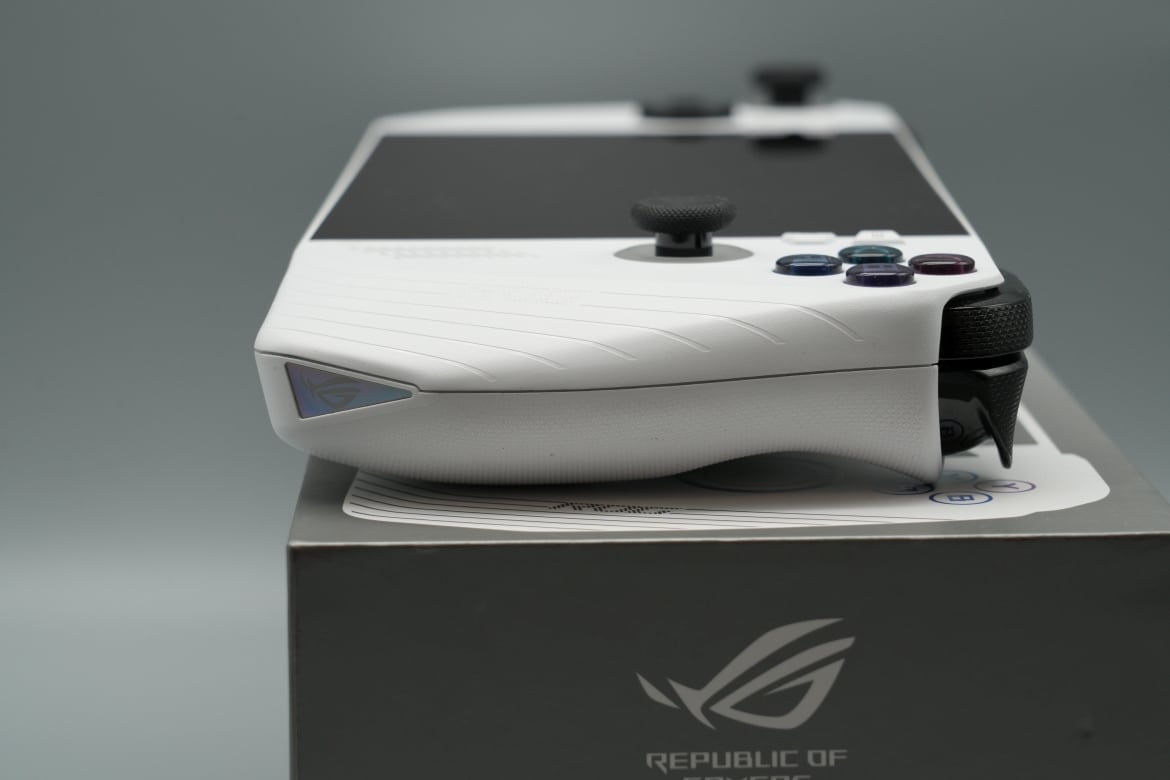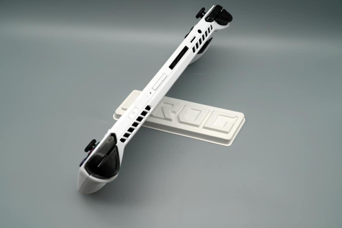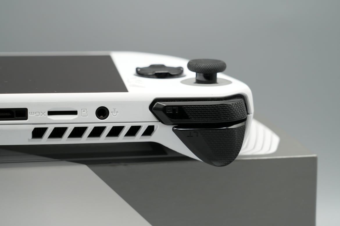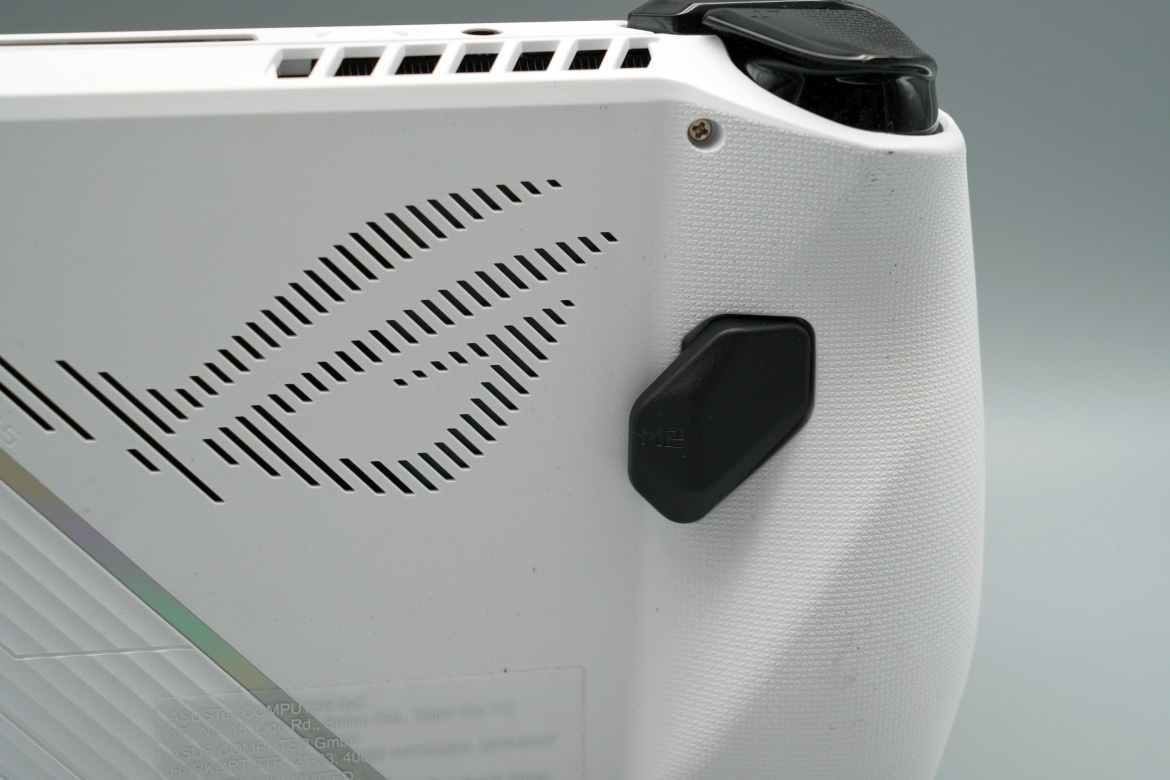Oben gibt es mit den LB- und RB-Bumpern, sowie die LT- und RT-Triggern vier zusätzliche Tasten, an der griffigen Rückseite finden bei ASUS zwei zusätzliche Buttons Platz, zwei weniger also als im Falle des Steam Deck.
