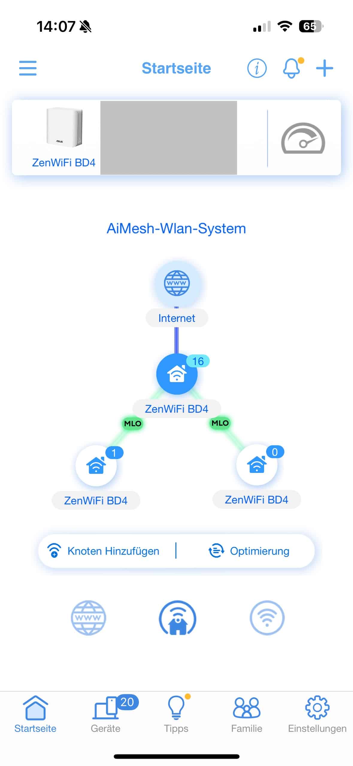 Hierfür musste ich allerdings wieder alle drei Elemente des Asus ZenWiFi BD4 zusammenführen, um sodann das Update herunterladen und installieren zu können. So kostete mich das Prozedere in Summe knappe 90 Minuten. Zum Vergleich: Die Deco-Systeme von TP-Link, welche ich bislang testen durfte, ließen sich deutlich schneller einrichten. Als ich mein Mesh dann aber endlich als 3er-Set auf Beine gestellt hatte, punktete die Asus-App wieder mit guter Übersicht und vielen Einstellungsmöglichkeiten.