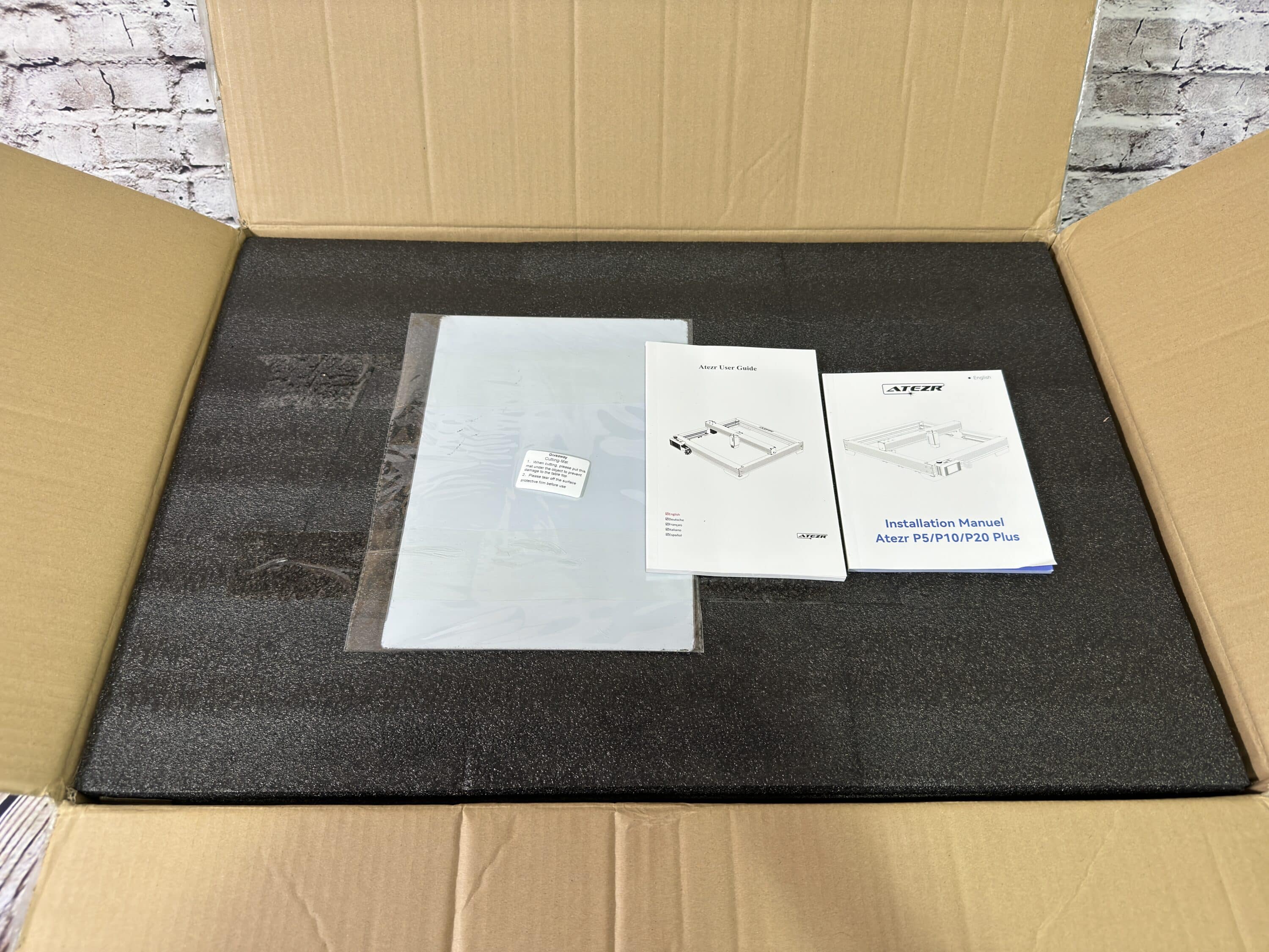 Geliefert wird der P5 in einem braunen Karton ohne eine kenntliche Aufschrift oder Logo von außen. Öffnet man das Paket, befinden sich die jeweiligen Einzelteile sorgfältig in schwarzem Schaumstoff verpackt. Des Weiteren befinden sich im Lieferumfang abgesehen von der Maschine selbst mit einem Toolkit zum Zusammenschrauben noch drei Holzplatten, die Bedienungsanleitung und Zubehör für die Bedienung der Maschine. Zuletzt ist noch besonders die mitgelieferte Sicherheitsbrille hervorzuheben, welche zum Schutz gegenüber des Lasers dient.
