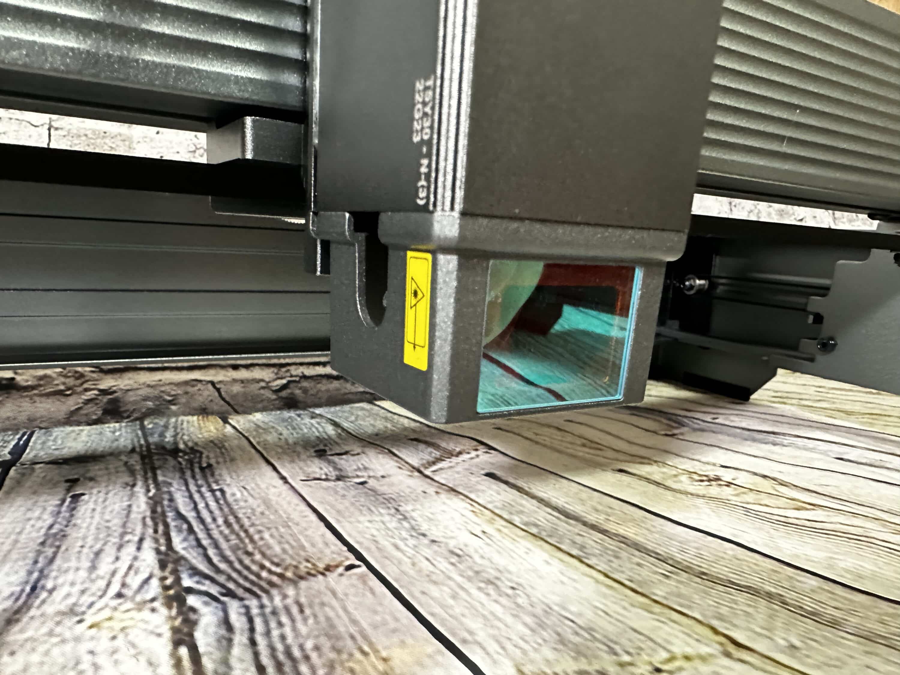 Als Erstes muss man dabei auf die Home-Taste tippen, damit der Laserkopf auf seine Startposition gelangt. Hiernach erfolgt ein weiterer Klick auf „Rahmen anzeigen lassen“ und der Laser bewegt sich einmal entlang dem äußeren Rahmen des Motives. Aufgrund dessen lässt sich das Material positionieren. Bevor es losgehen kann muss noch die Höhe des Laserkopfs eingestellt werden. Dafür wird eine kleine und eher unhandliche Justierstange an der Seite des Laserkopfes ausgeklappt, bis sie auf das Material aufstößt und somit die perfekte Höhe feststeht.