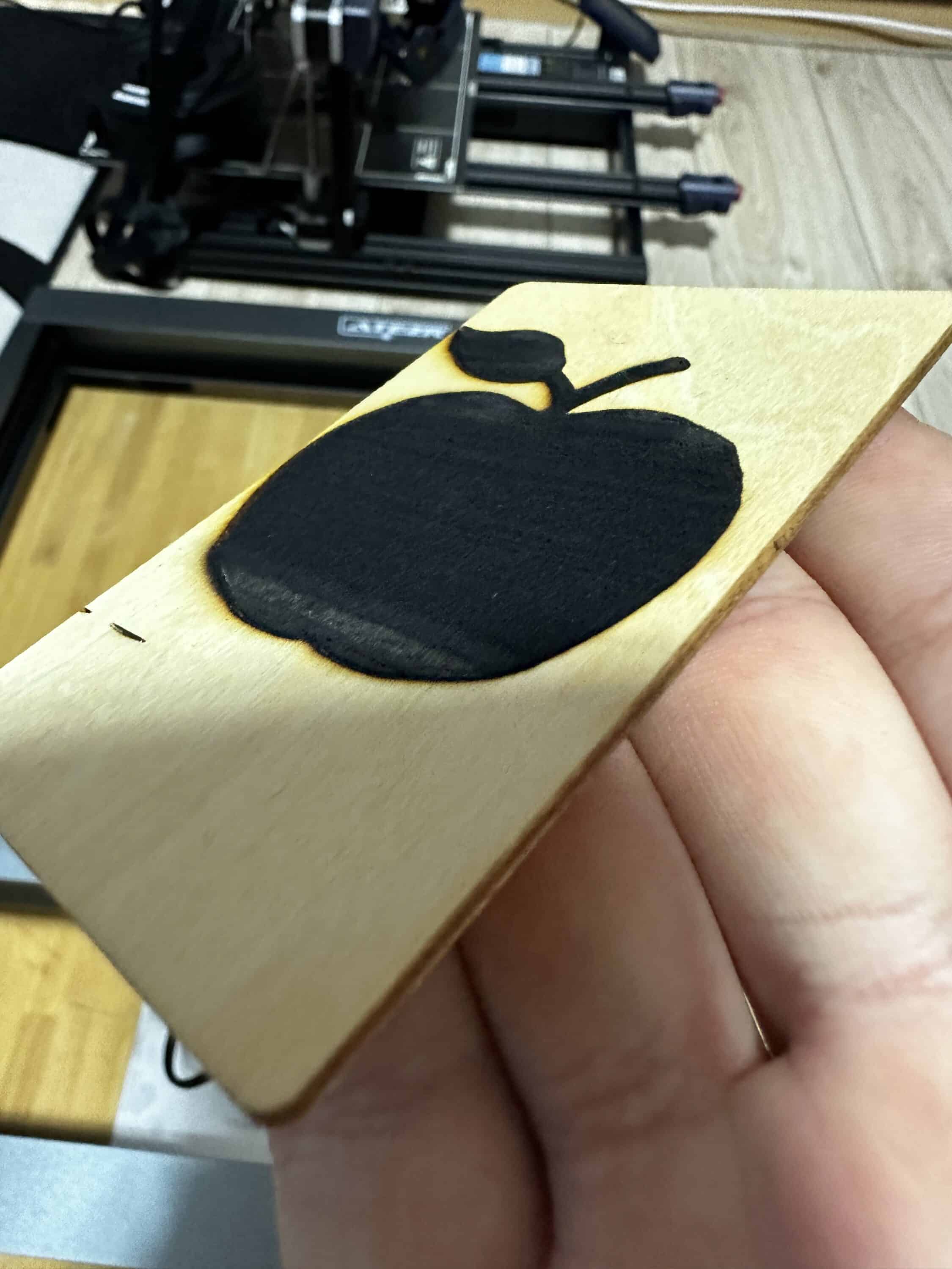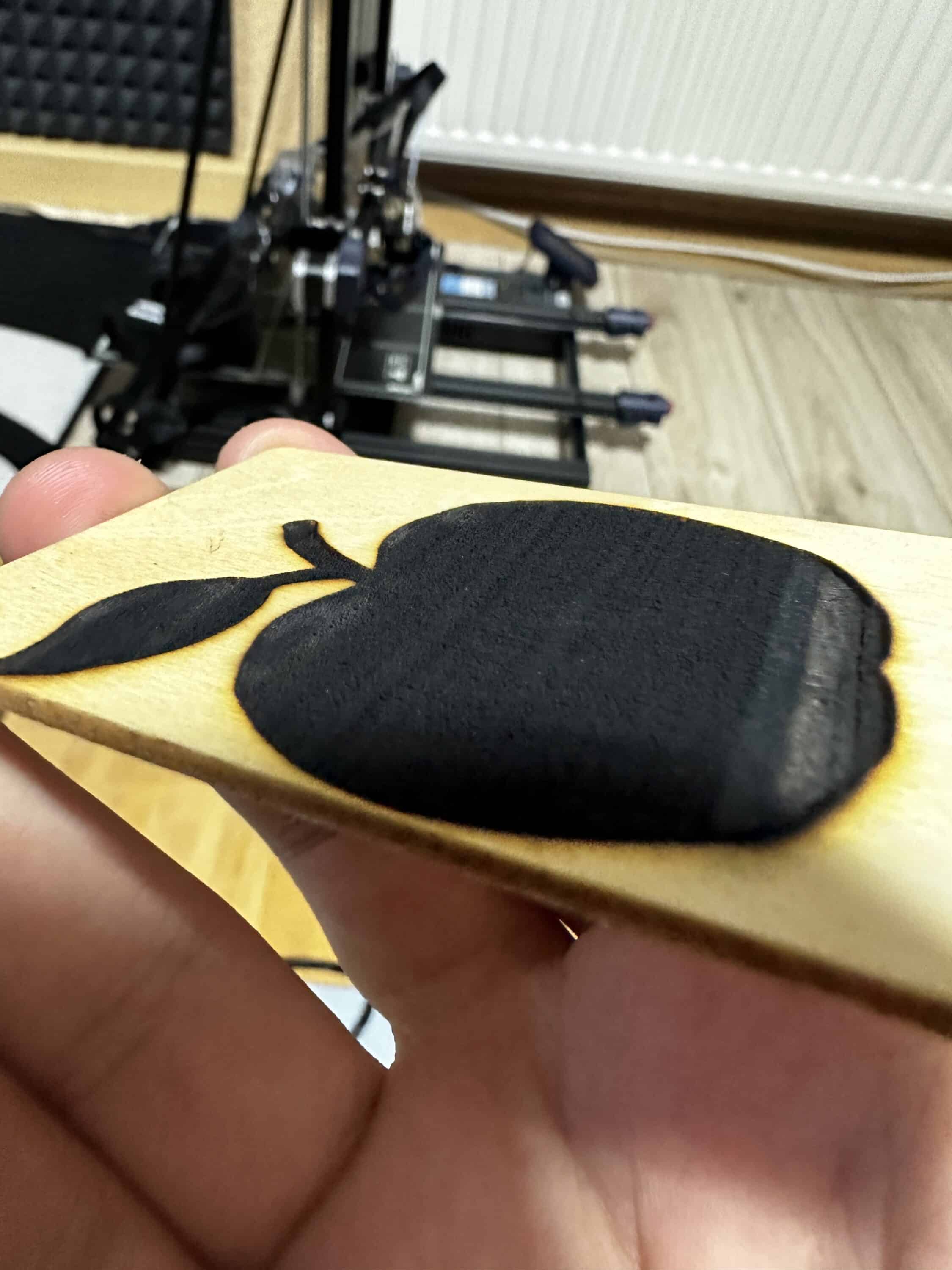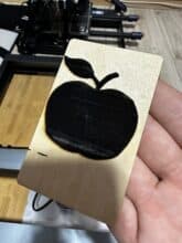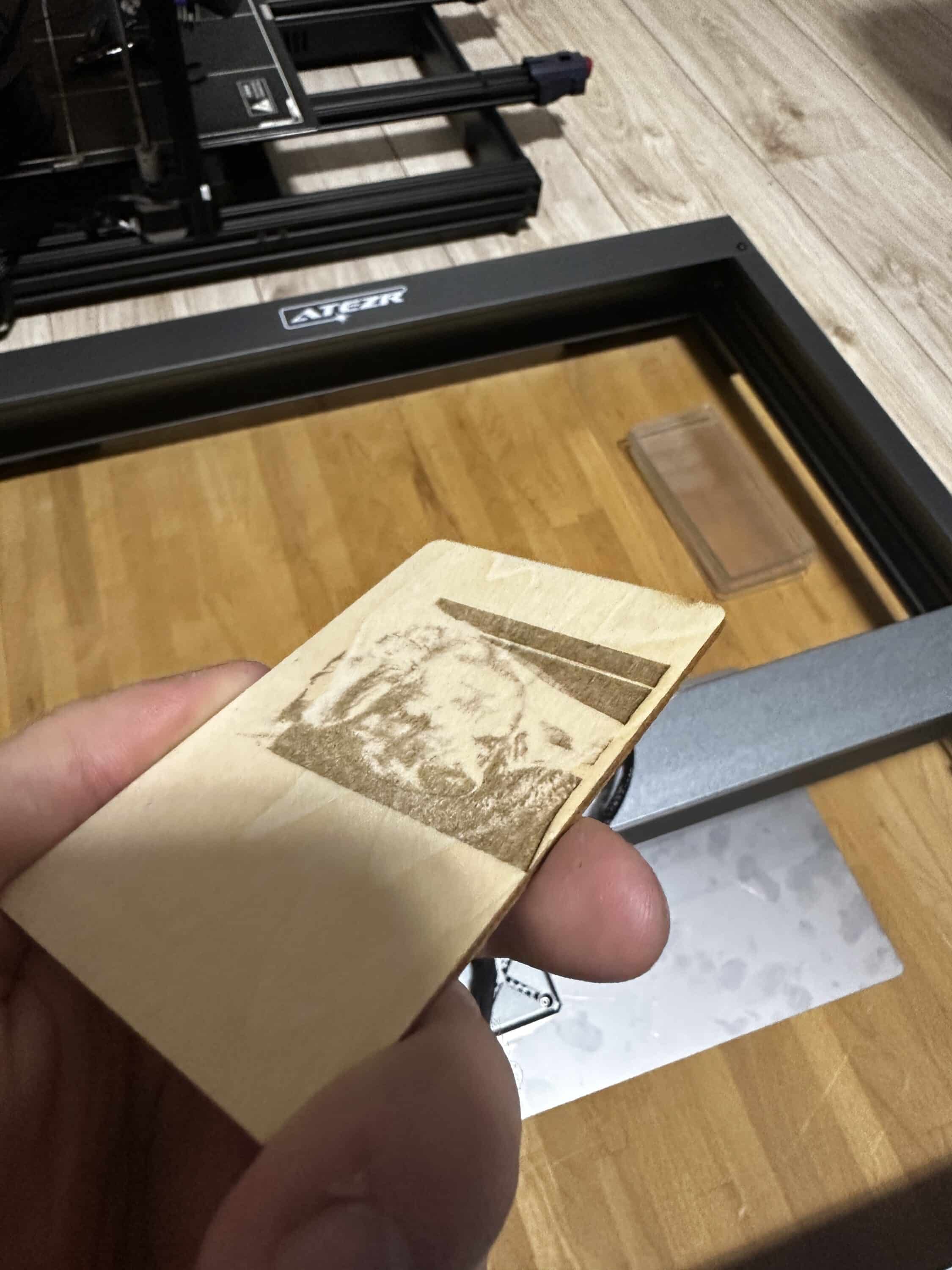Nach dem Start und einer recht kurze Wartezeit von rund 15 Minuten für kleine Motive ist die Gravur schon erledigt. Im ersten Versuch haben wir uns für Holz als Material entschieden und direkt einen kleinen Fehler gemacht: Nicht die Geschwindigkeit und die Stärke angepasst. Die Gravur sah am Ende sehr schwarz und verbrannt aus, die Ränder des Motivs waren jedoch perfekt und genau graviert.