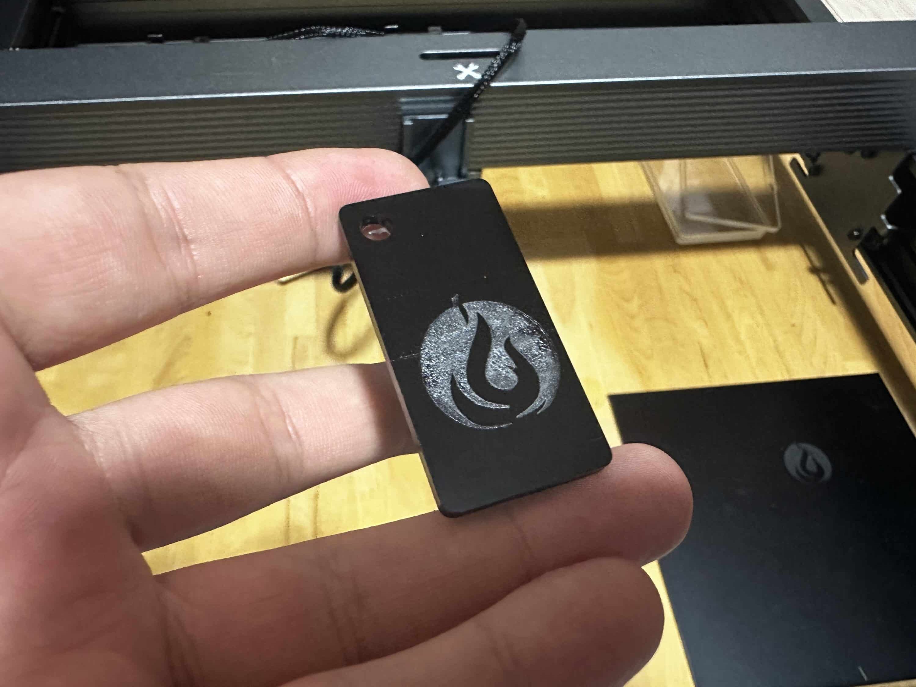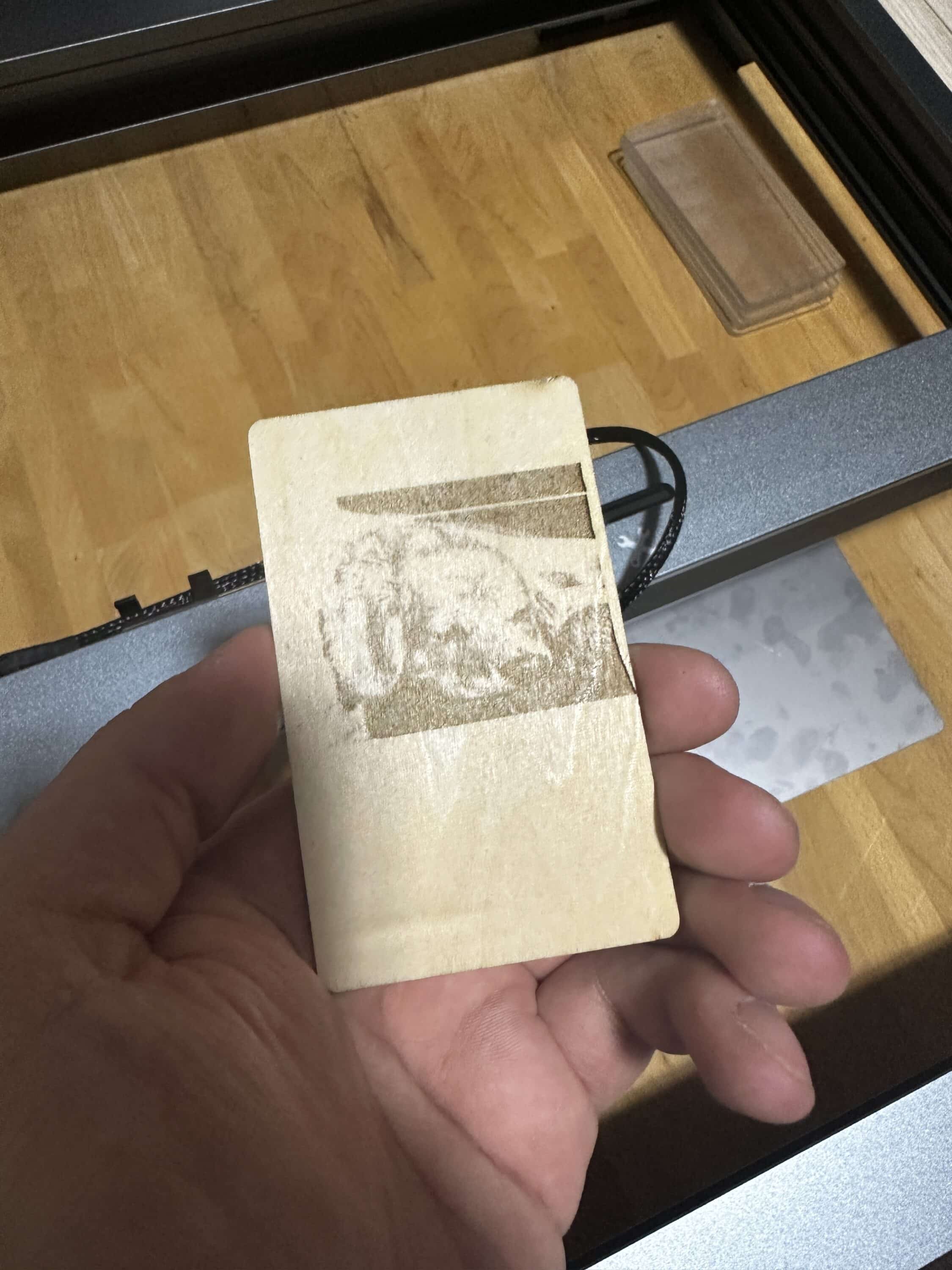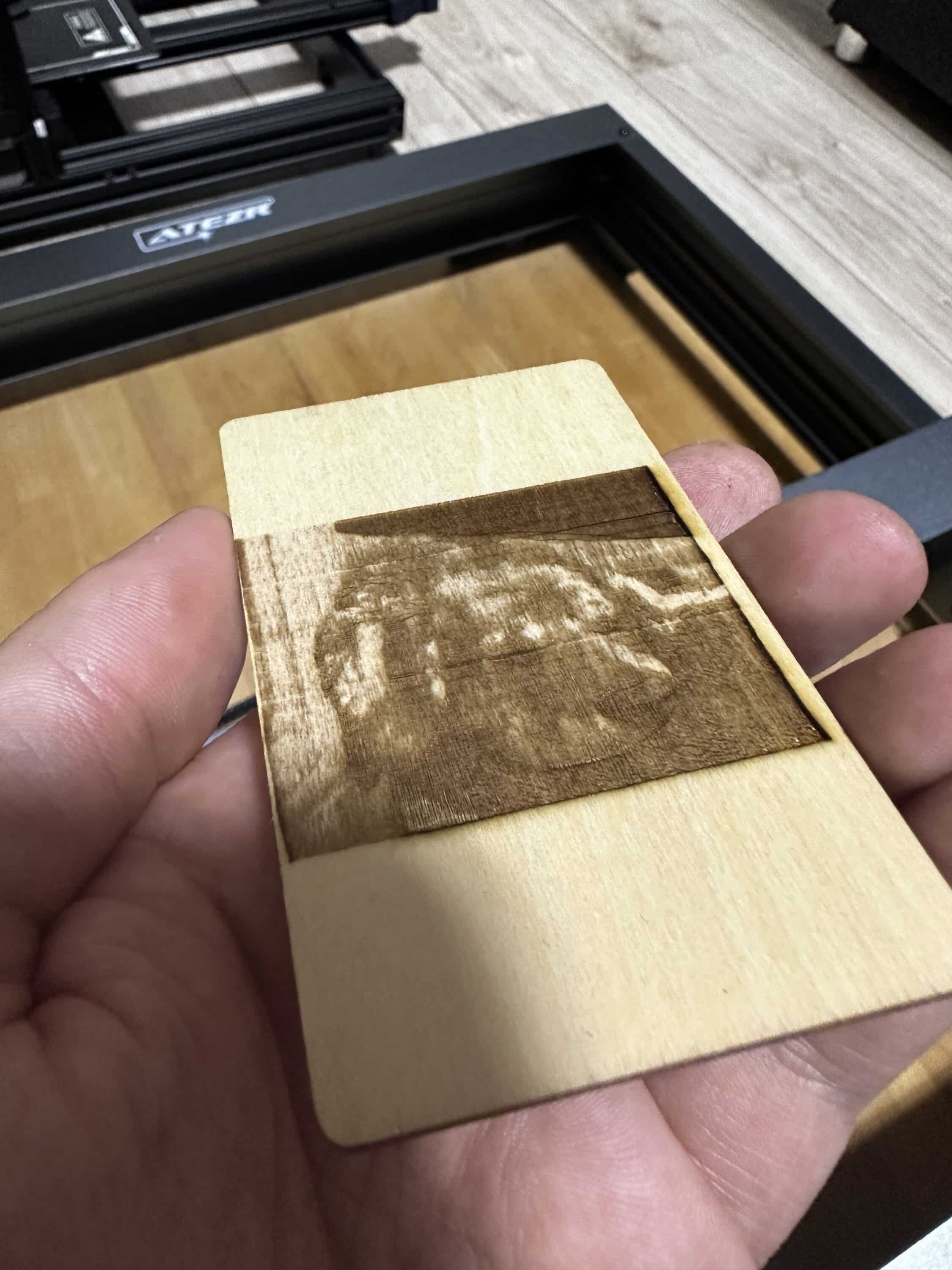 Nach dem Start und einer recht kurze Wartezeit von rund 15 Minuten für kleine Motive ist die Gravur schon erledigt. Im ersten Versuch haben wir uns für Holz als Material entschieden und direkt einen kleinen Fehler gemacht: Nicht die Geschwindigkeit und die Stärke angepasst. Die Gravur sah am Ende sehr schwarz und verbrannt aus, die Ränder des Motivs waren jedoch perfekt und genau graviert.