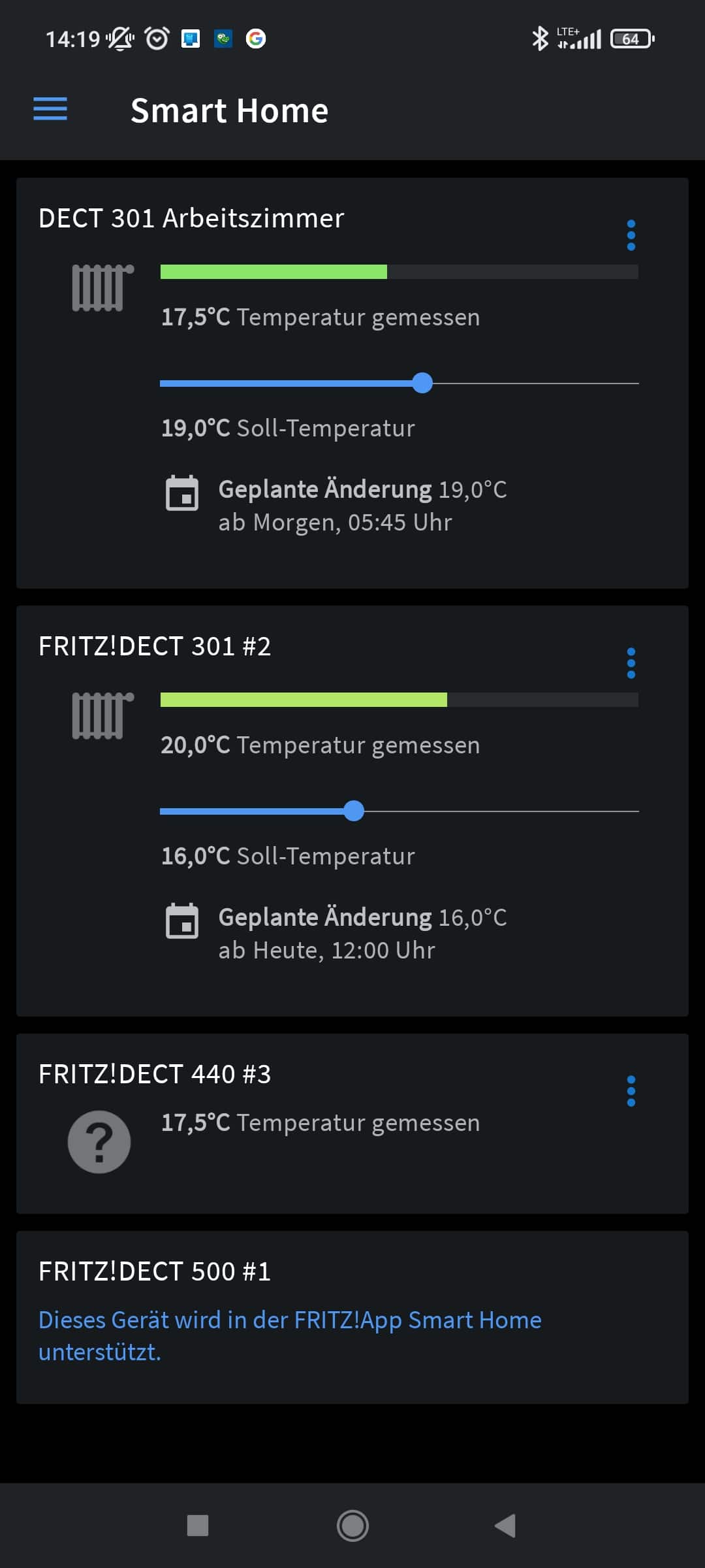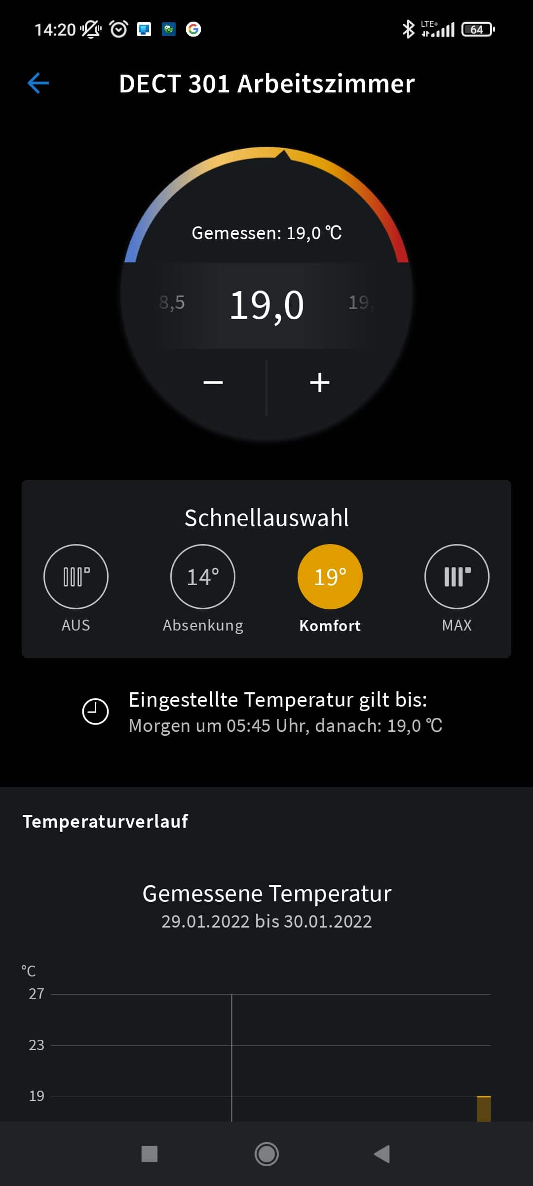 Dann gibt es noch die Smart Home-App von AVM. Auch diese ist nicht wirklich umfangreich und die beste Möglichkeit zu Einstellung ist immer noch über die Oberfläche der FRITZ!Box. In der App kann die Temperatur präziser eingestellt werden und ihr habt schnelleren Zugriff auf die Komfort- und Absenktemperatur. Viel mehr als die Statistik der letzten 24 Stunden gibt es aber auch nicht.